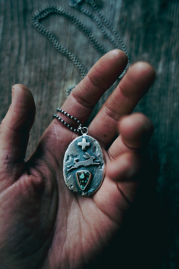 I have loved starting a new year of work with these jackrabbits! They are too much fun to make. I have paired this jackrabbit with a speckled slice of American turquoise atop a heavy, milled ingot that is rugged with texture and organic in form. This necklace has a really lovely heft and presence. I hope it becomes a touchstone piece for its wearer -- an earthy, peaceful necklace born of wide open spaces and stillness.