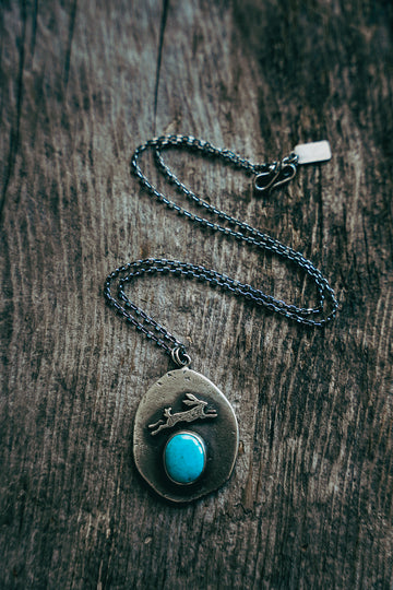 I have loved starting a new year of work with these jackrabbits! They are too much fun to make. I have paired this jackrabbit with sky blue Kingman turquoise atop a heavy, milled ingot that is rugged with texture and organic in form. This necklace has a really lovely heft and presence. I hope it becomes a touchstone piece for its wearer -- an earthy, peaceful necklace born of wide open spaces and stillness.