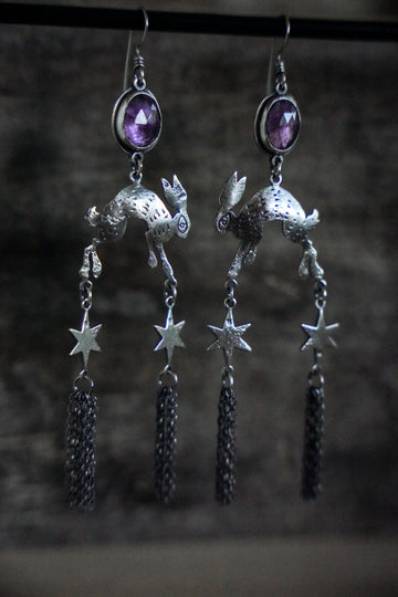 I haven't used jackrabbit motifs in my work for YEARS and it feels very good to return to using these gentle creatures in my jewelry narrations. If you claim a pair of these earrings, I hope you can feel the desert in them: the sun, the wind, the stars, the blinking jackrabbit in the sagebrush and the owl on the wing.
