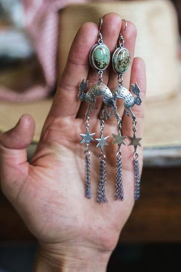I haven't used jackrabbit motifs in my work for YEARS and it feels very good to return to using these gentle creatures in my jewelry narrations. If you claim a pair of these earrings, I hope you can feel the desert in them: the sun, the wind, the stars, the blinking jackrabbit in the sagebrush and the owl on the wing.