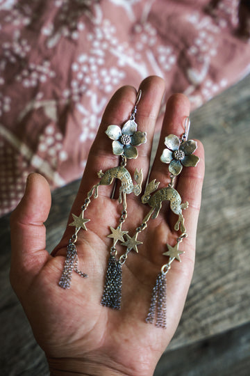 My folky jackrabbits combined with stars, blossoms and tassels. It's almost too much magic. These earrings are a wonderful labor of love! I hope I never retire this design.