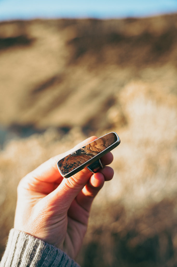 There's not much of a story behind this ring design -- it's all about the stone and the metalwork. This is a large and in charge cut of Deschutes jasper. Wear the land you love. WEAR THE WEST!!! I've set it cleanly in heavy sterling atop a super burly band. Three brass crosses grace the bezel edge. This ring is lovely and enduring. Wear it and feel your heart and mind wander out into the open country of your imagination.