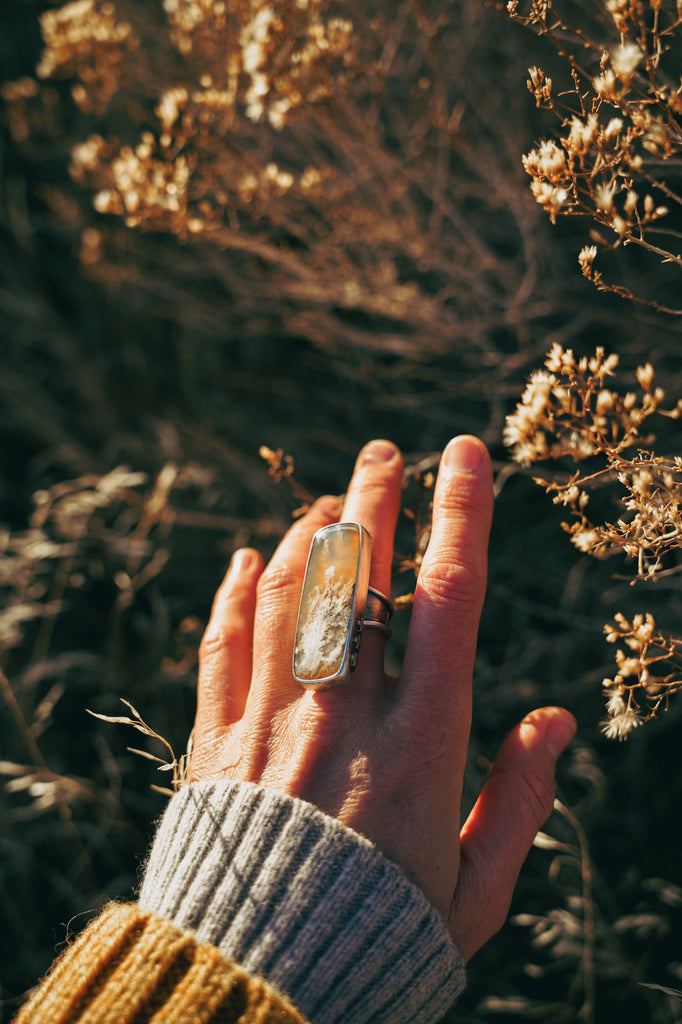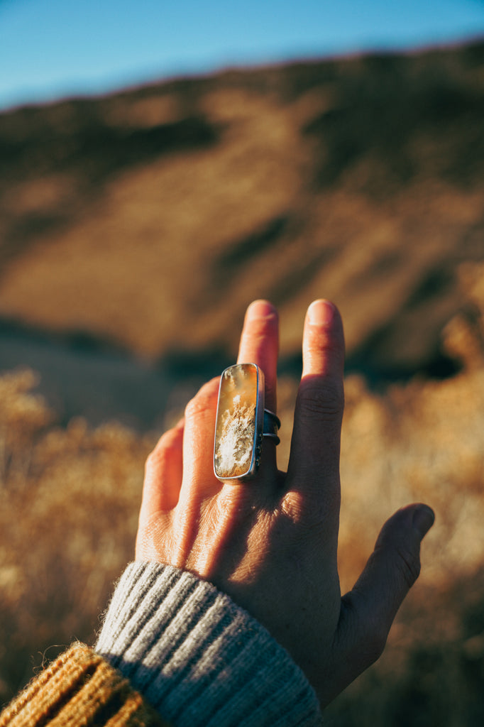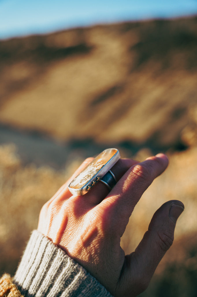 There's not much of a story behind this ring design -- it's all about the stone and the metalwork. This is a big old beautiful, cosmic looking cut of Regency Rose Plume Agate. I've set it cleanly in heavy sterling atop a super burly band. Three brass crosses grace the bezel edge. This ring is lovely and enduring. Wear it and feel your heart and mind wander out into the open country of your imagination.