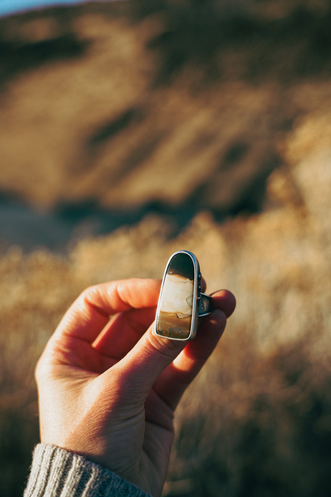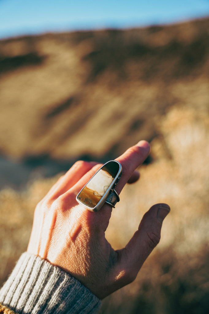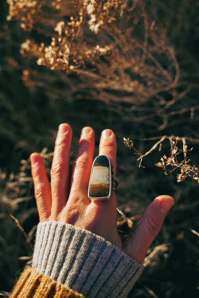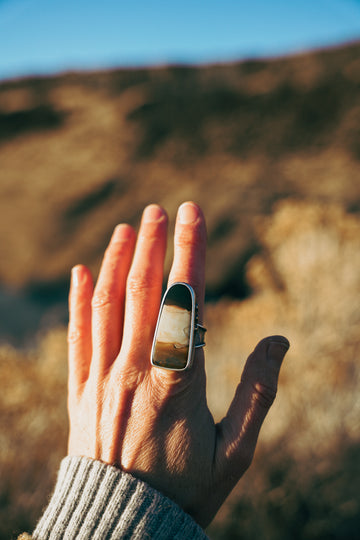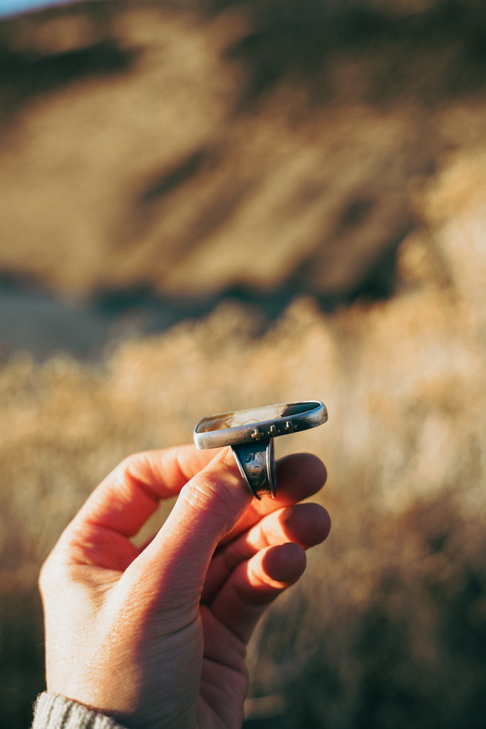 There's not much of a story behind this ring design -- it's all about the stone and the metalwork. This is a great cut of Morrisonite (KING OF JASPERS) in gorgeous natural colors: ochre, deep forest green and rust-mottled creme. Morrisonite is not a landscape jasper and I tend to describe it as "painterly" or abstracted in appearance. This is a really great sample of the material and I've set it cleanly in heavy sterling atop a super burly band. Three brass crosses grace the bezel edge. This ring is lovely and enduring. Wear it and feel your heart and mind wander out into the open country of your imagination.
