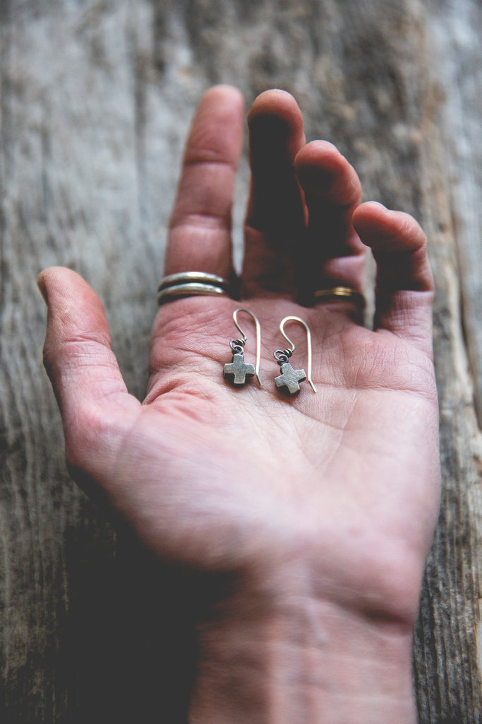Textural, three dimensional, rugged little sterling crosses on simple french ear wires -- for everyday wear to help remind you that the load is lighter than you think.