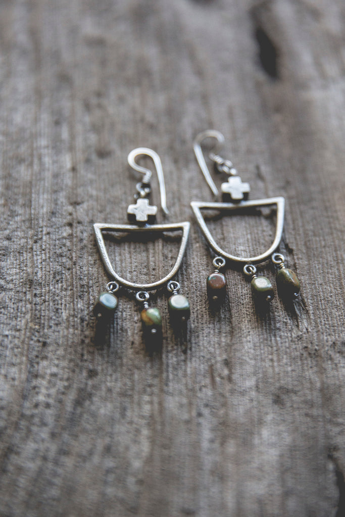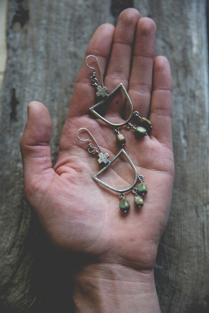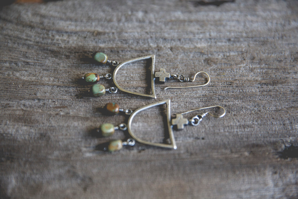 Heavily textured, three dimensional, rugged sterling crosses crown heavy sterling half-round hoops from which earthy turquoise beads jingle and sway. These earrings are simple and luminous -- for everyday wear to help remind you that the load is lighter than you think.
