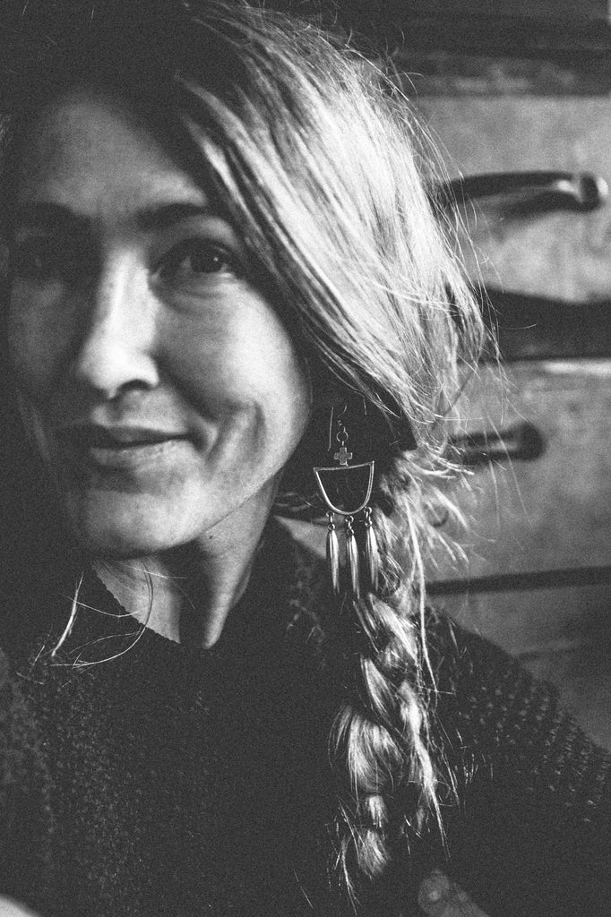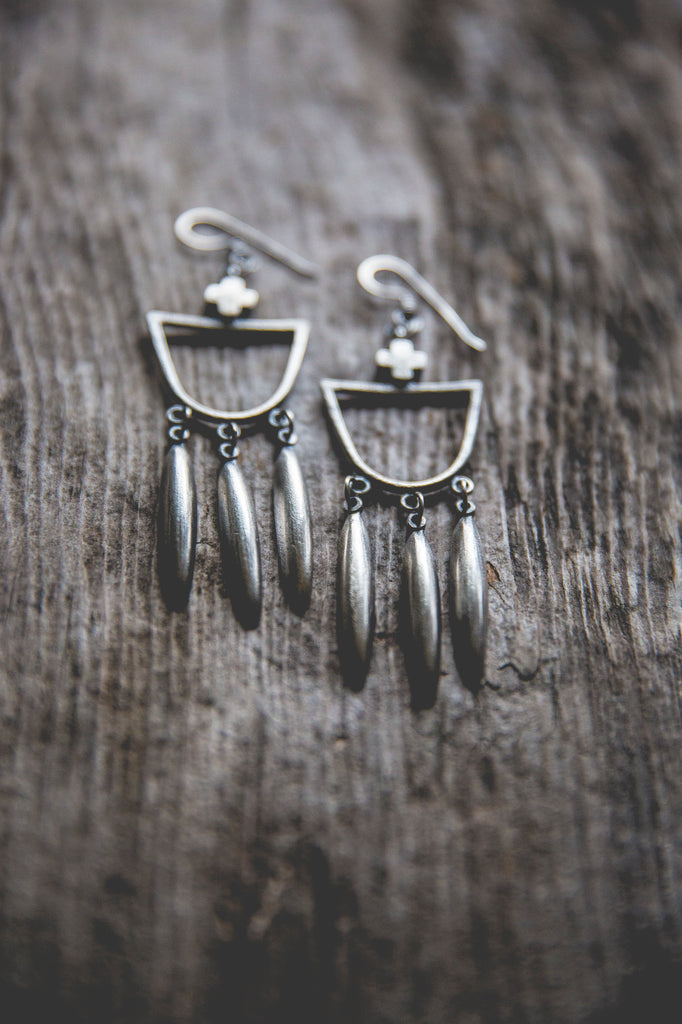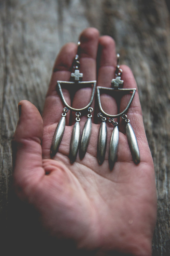 Heavily textured, three dimensional, rugged sterling crosses crown heavy sterling half-round hoops from which long half-beads jingle and sway. These earrings are simple, old timey, musical and luminous -- for everyday wear to help remind you that the load is lighter than you think.