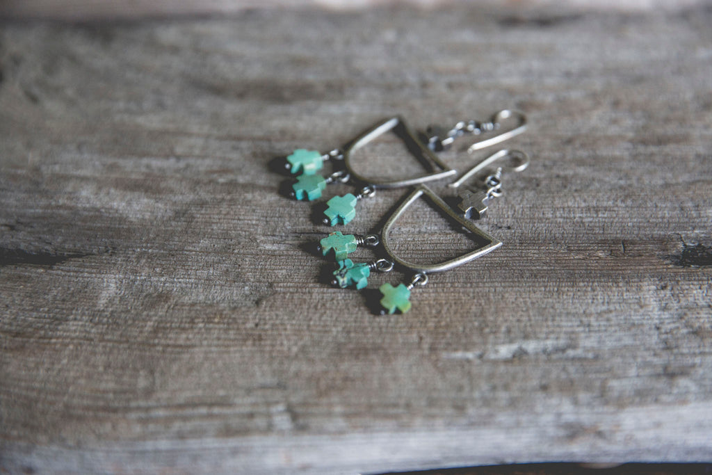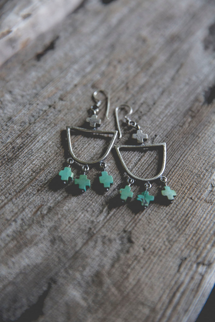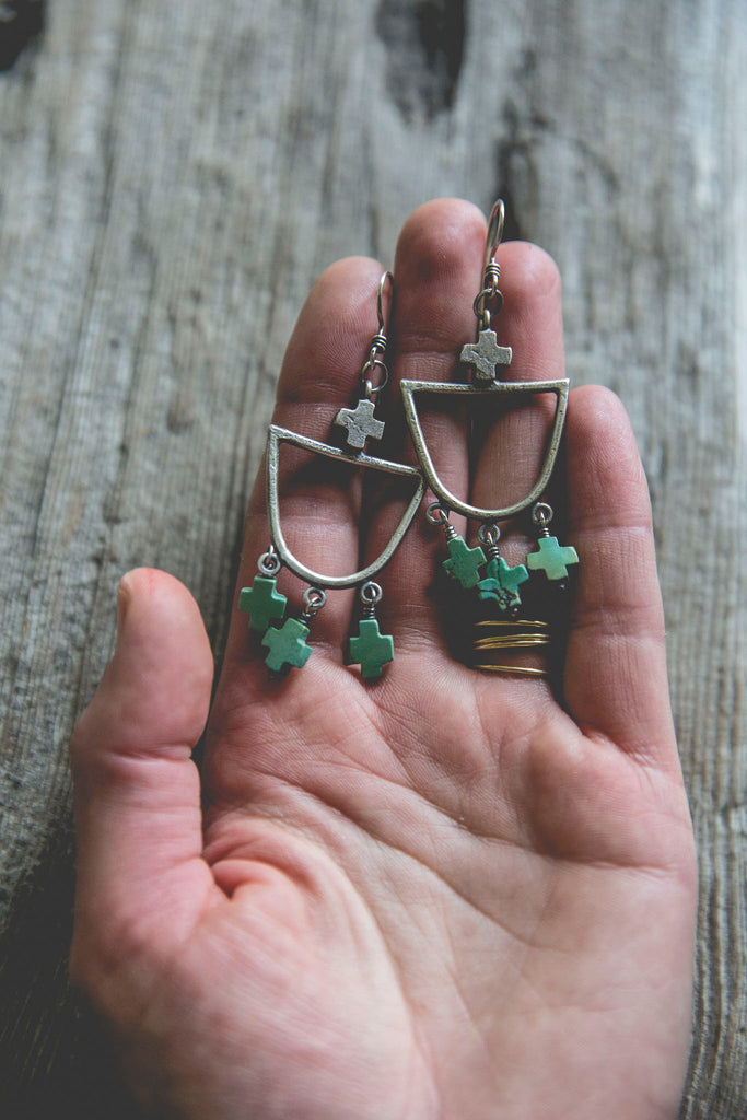 Heavily textured, non-traditional hoop earrings featuring old carved turquoise cross beads. These earrings are simple and luminous -- for everyday wear to help remind you that the load is lighter than you think.