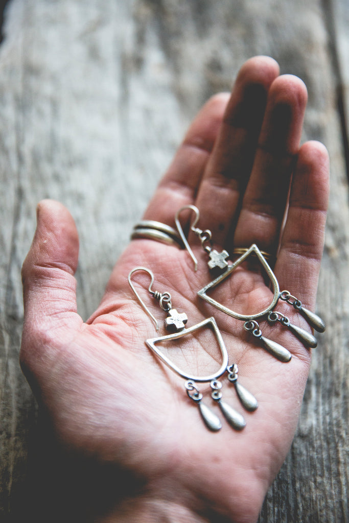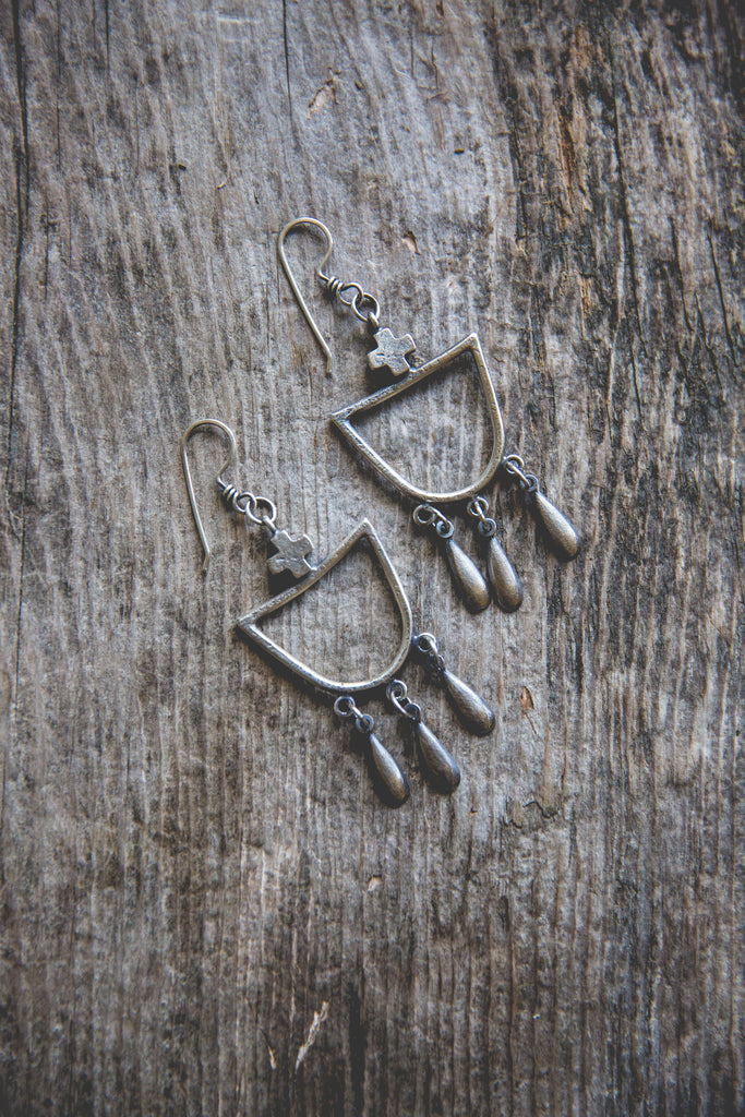 Heavily textured, three dimensional, rugged sterling crosses crown heavy sterling half-round hoops from which sterling teardrops jingle and sway. These earrings are simple, old timey, musical and luminous -- for everyday wear to help remind you that the load is lighter than you think.