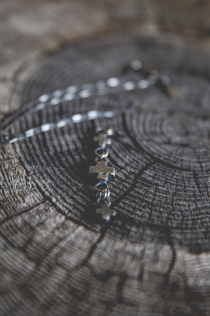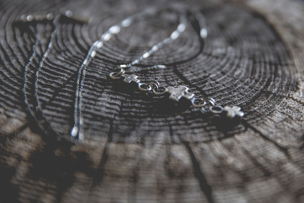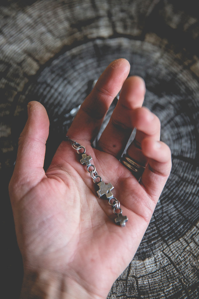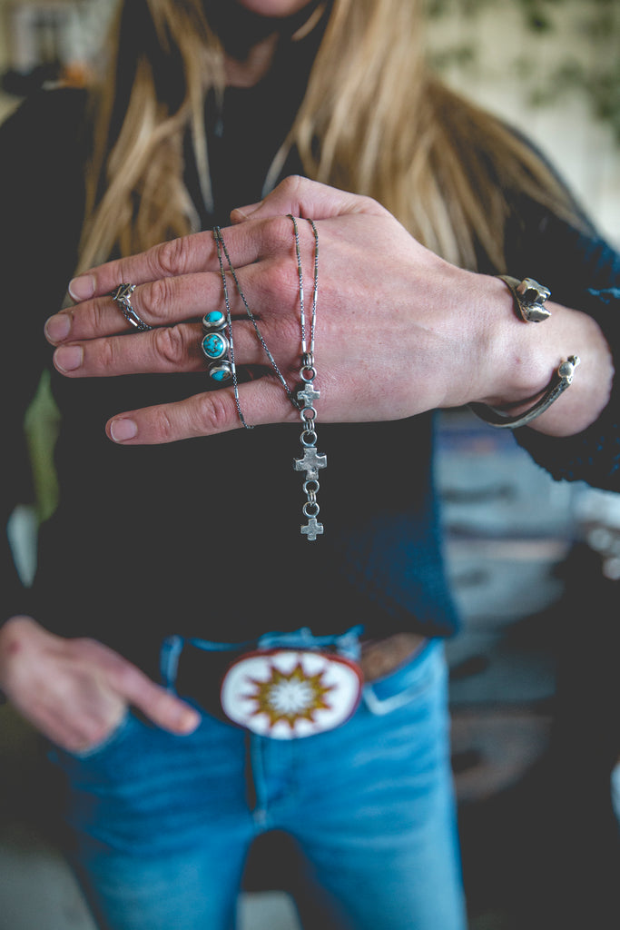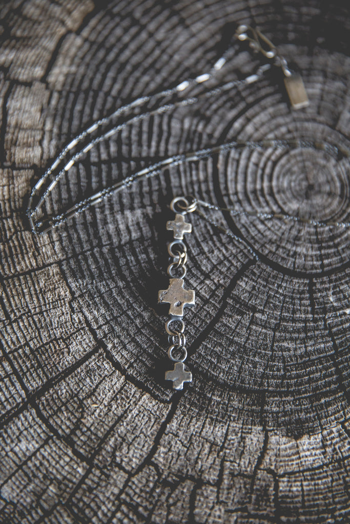 This is a deceivingly simple looking pendant featuring a trio of heavily textured, chunky square crosses but this piece is made beautiful by the movement and weight of the pendant and further elevated by the luxe chain I chose for it. This necklace is timeless in the truest sense of the word and made for everyday wear to help remind you that the load is lighter than you think.