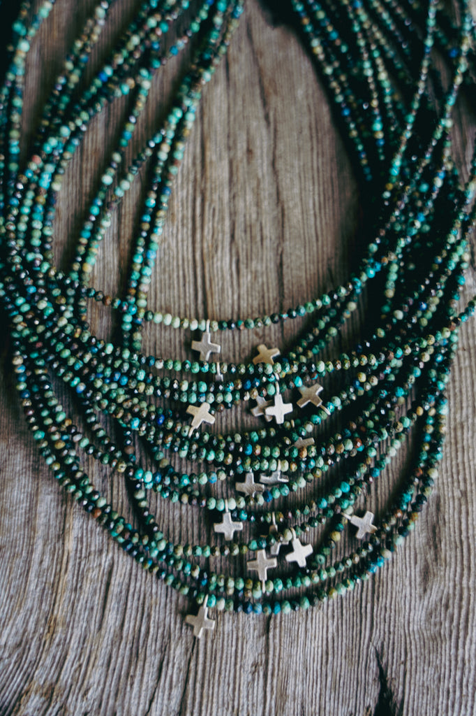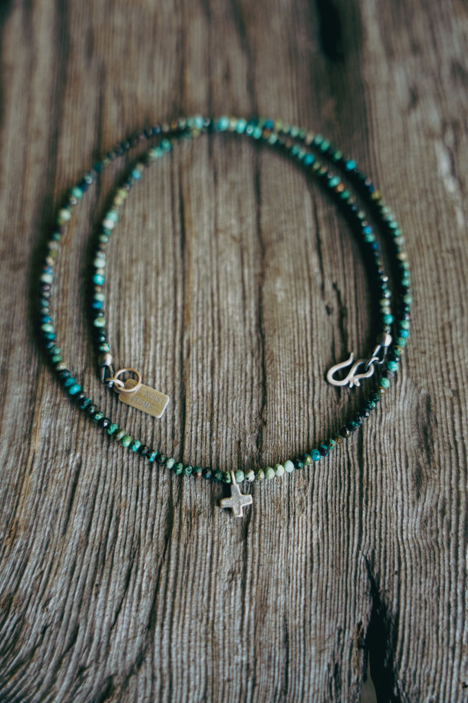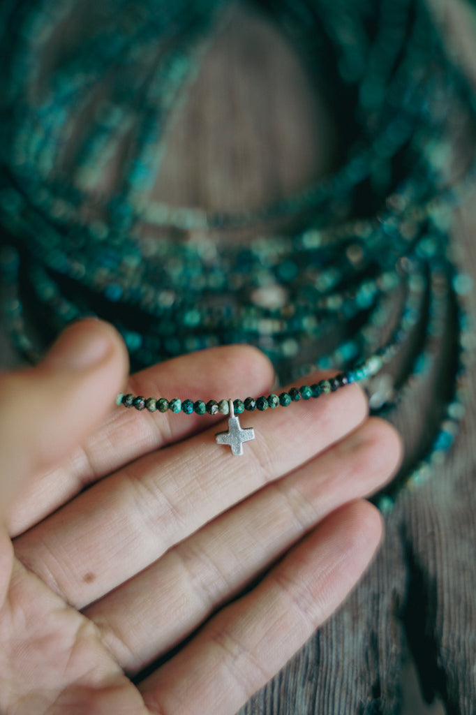 My square cross strung on a strand of earthy chrysocolla beads -- for everyday wear to help remind you that the load is lighter than you think.