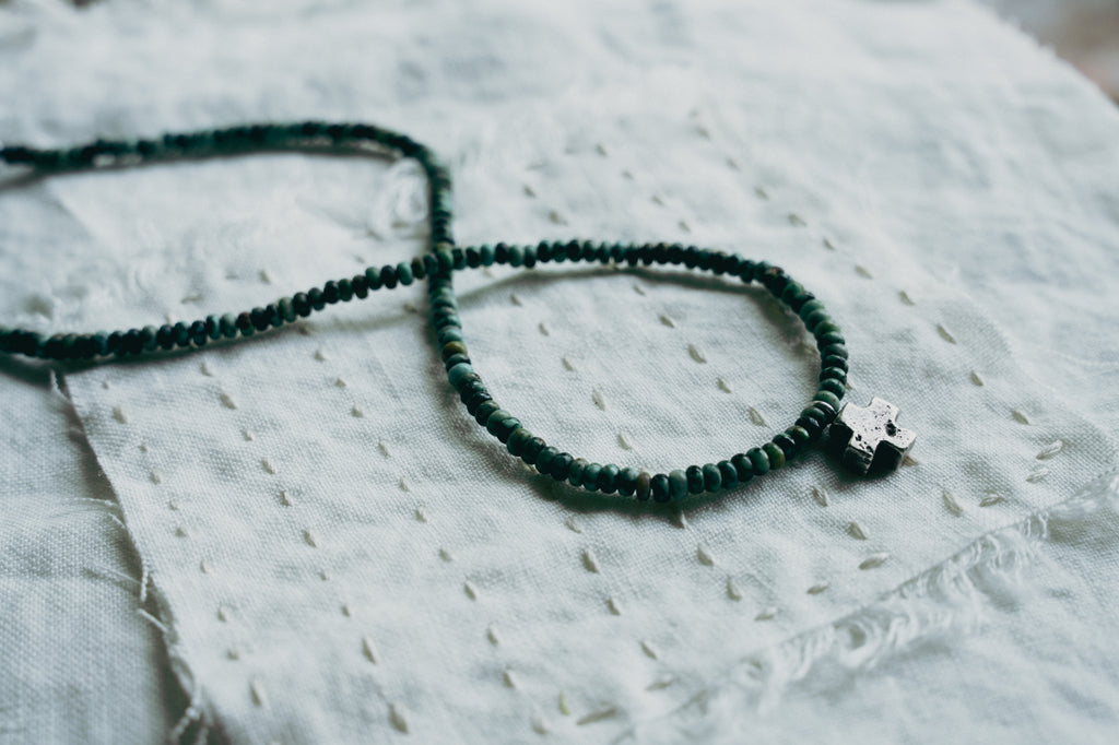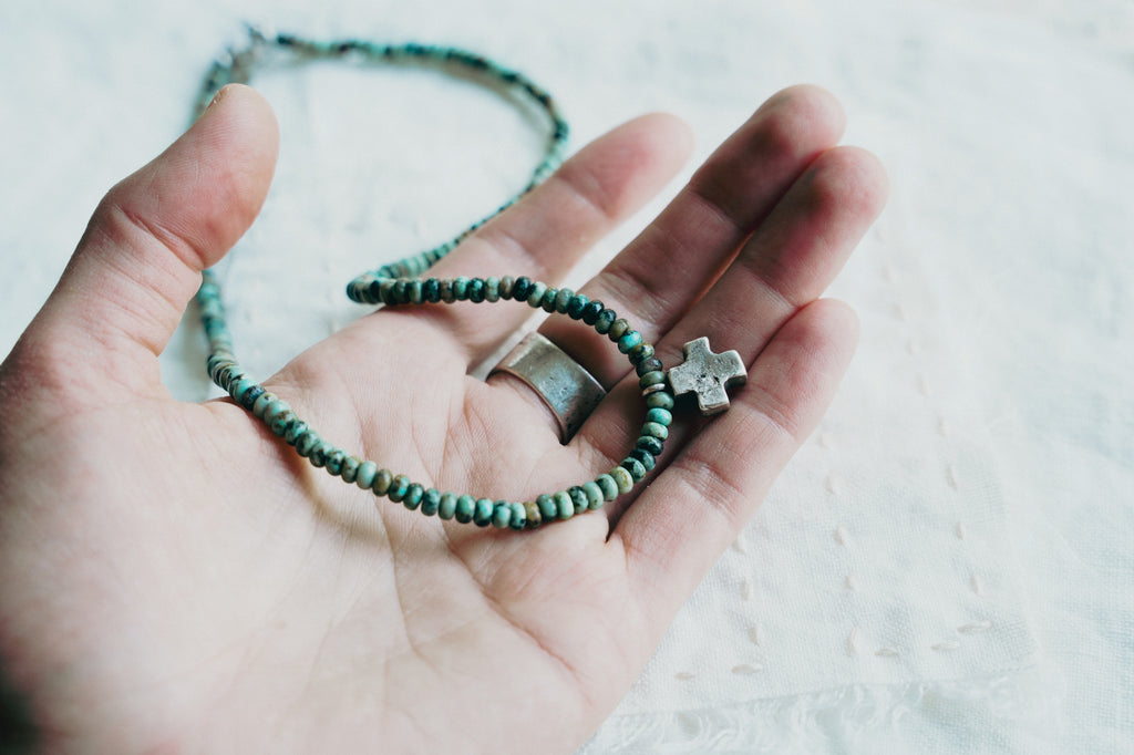My rugged square cross strung on a strand of earthy jasper beads -- for everyday wear to help remind you that the load is lighter than you think.