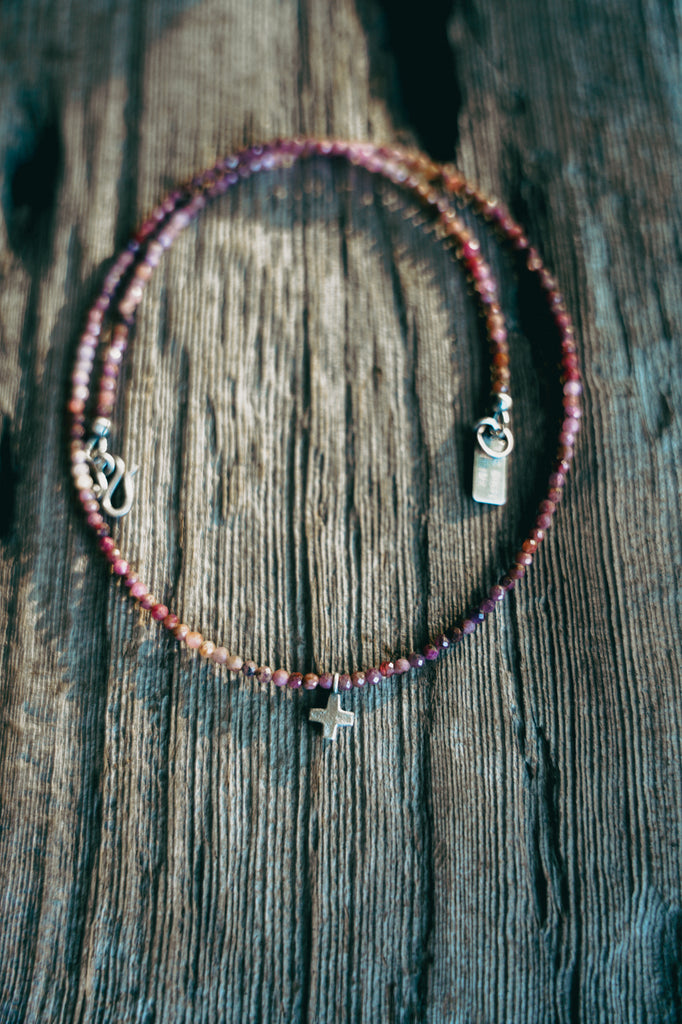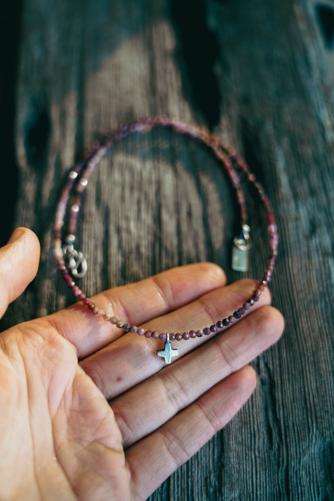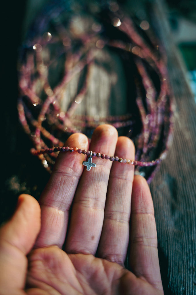 My square cross strung on a strand of earthy rubies -- for everyday wear to help remind you that the load is lighter than you think.