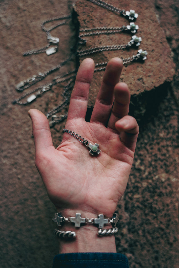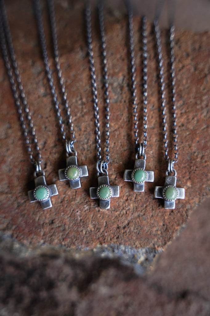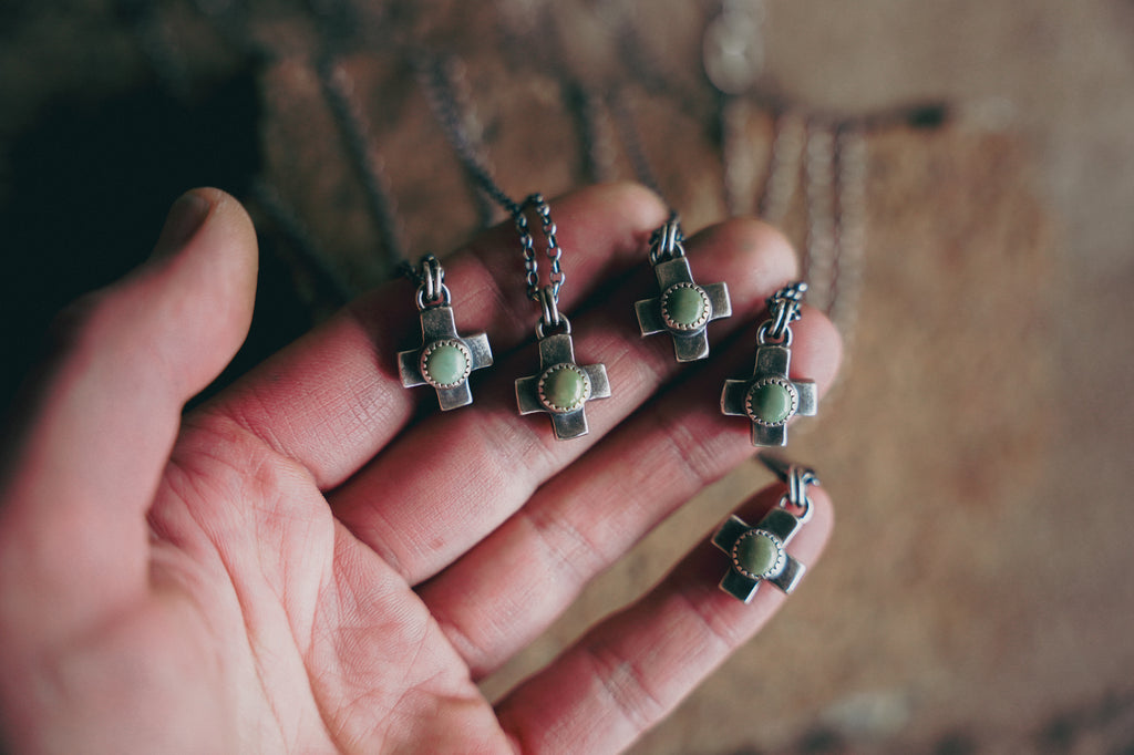 My chunky little rugged square cross with a daub of Kingman turquoise in an earthy green hue -- for everyday wear to help remind you that the load is lighter than you think.