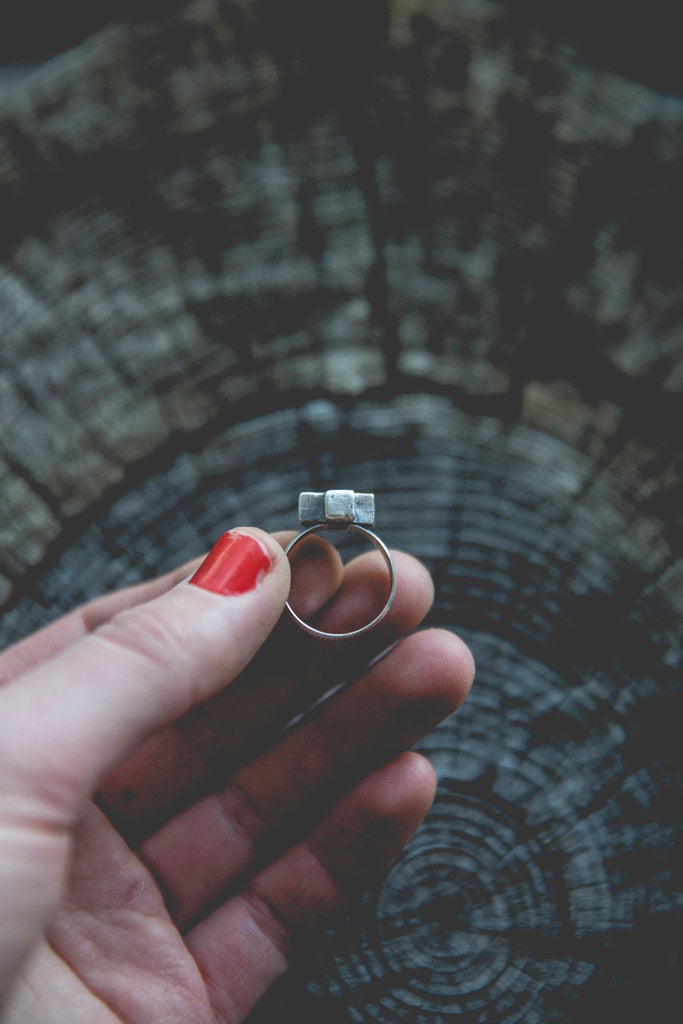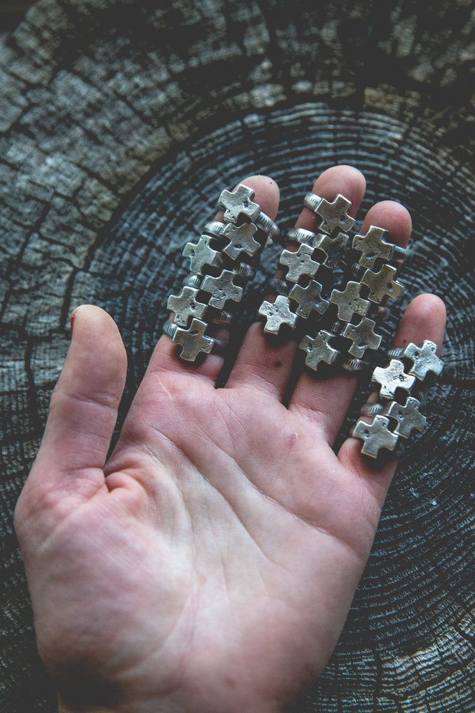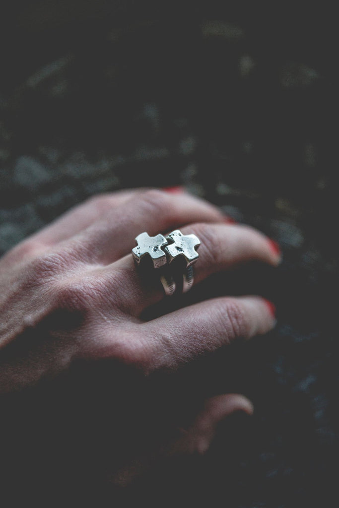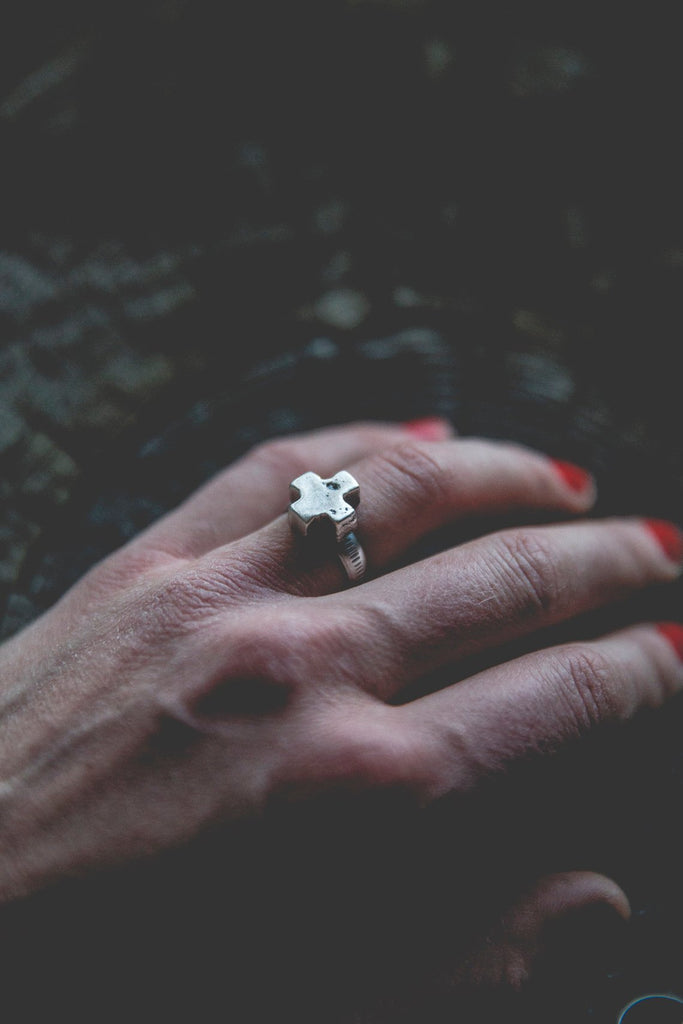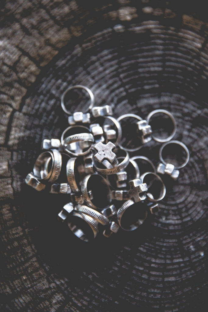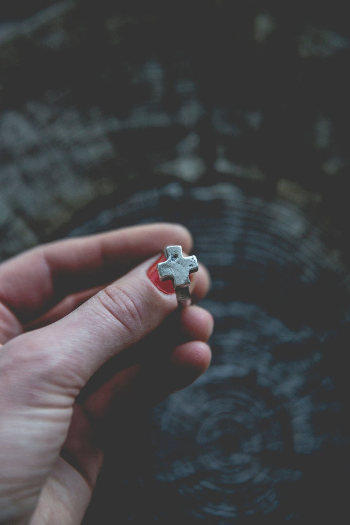 Heavily textured, three dimensional, rugged sterling crosses on burly, hand stamped bands. Simple. Delicate. Perfectly weighted. These rings are for everyday wear to help remind you that the load is lighter than you think.