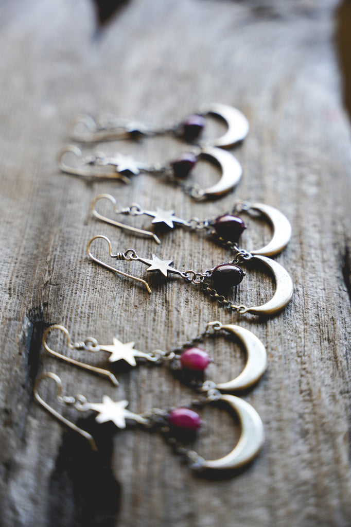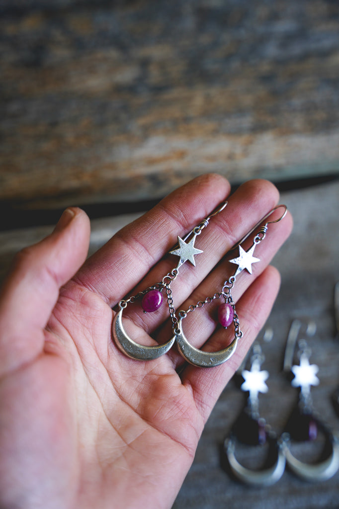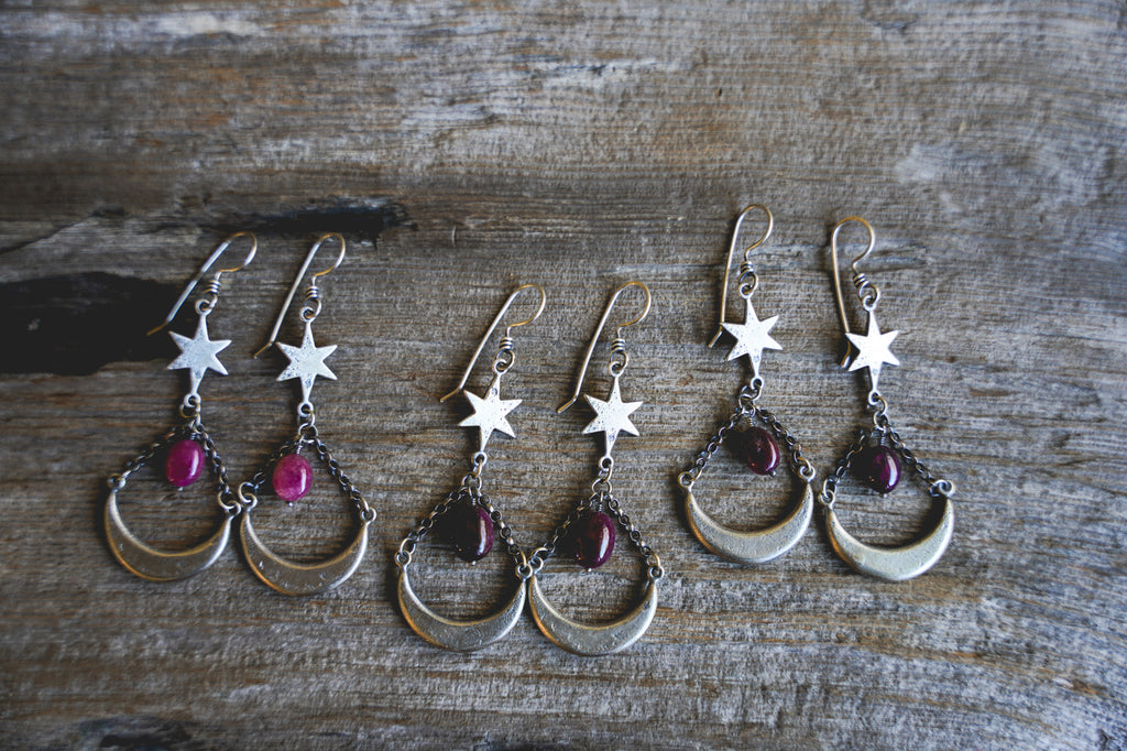 Fat little moons suspended from gritty little stars and warm rubies. You'll feel the presence of these earrings like you feel the presence of the moon and stars on dark nights.