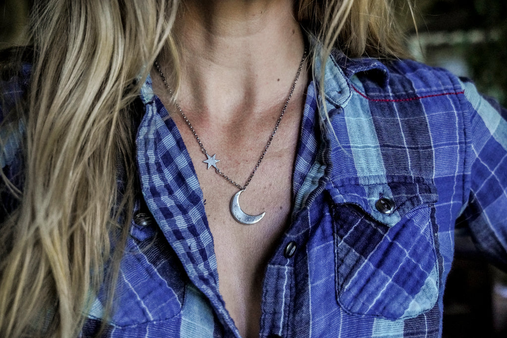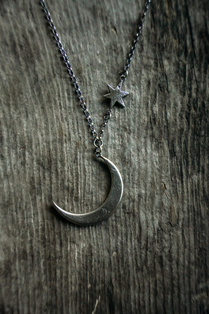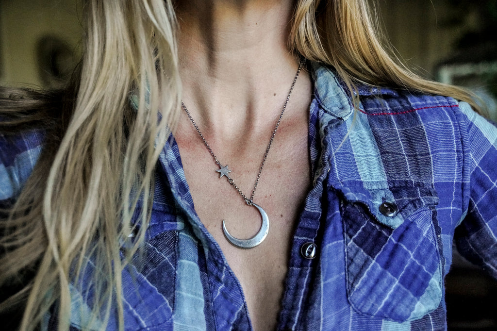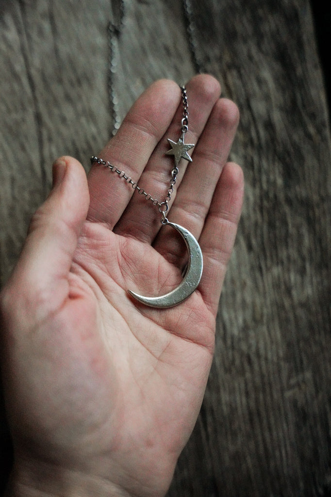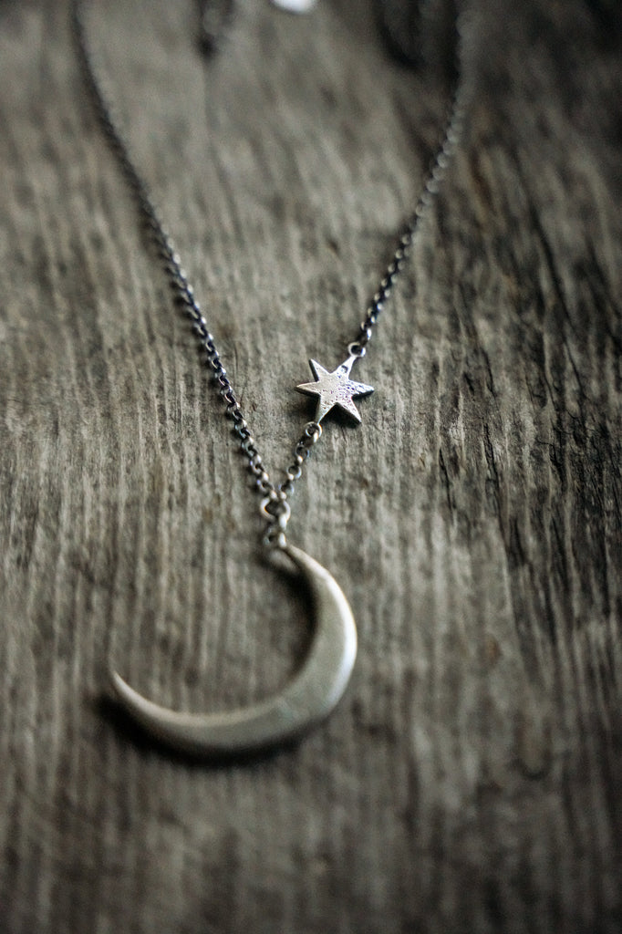 I wanted a fat little moon for this necklace design so I layered up a few pieces of sterling silver, soldered them together, and then meticulously hand formed these moons with various files before texturing them -- they are plump little things that bear some weight. You will feel the presence of this piece around your neck, like you feel the presence of the moon and stars on dark nights.
