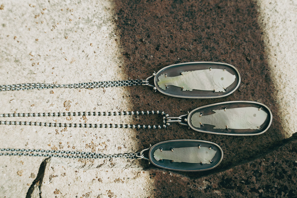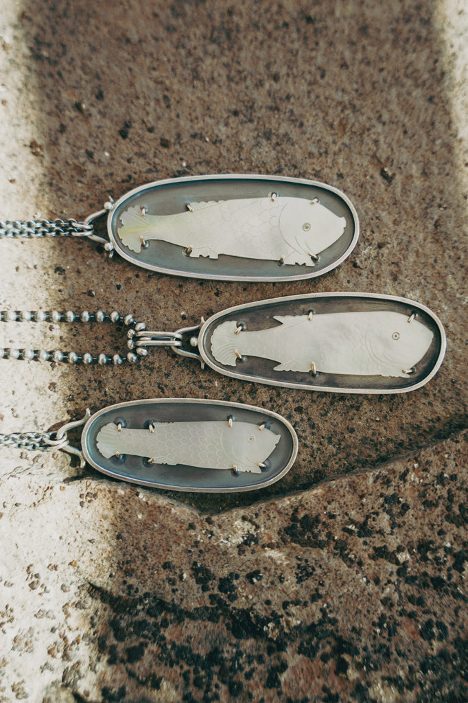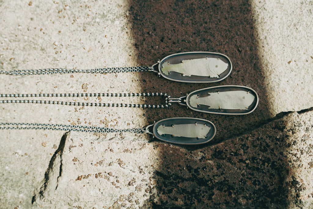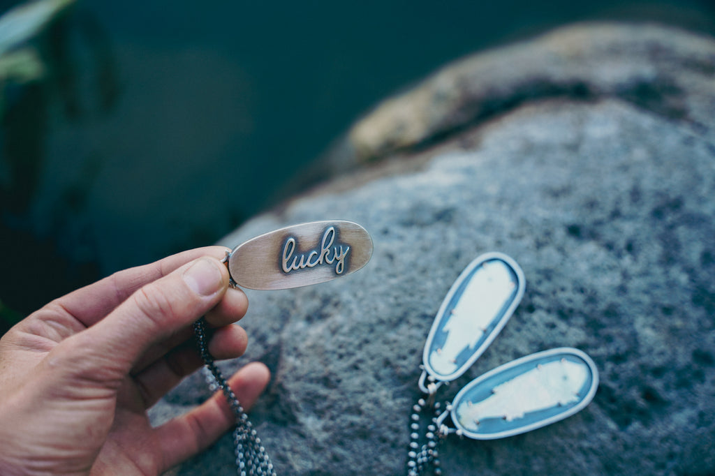 I picked up these antique Chinese mother of pearl gaming chips from a vintage vender at the Tucson Gem Show years ago and rediscovered them in my cabochon collection recently and decided to use them in a necklace design. They're unusual and quite charming. They are prong set here in little sterling silver frames. The reverse of the pendants reads "LUCKY"...just in case you need a little.