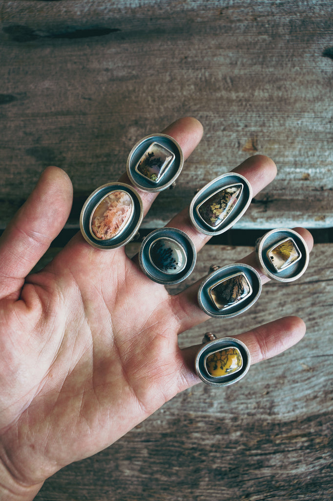 Note: This batch of rings features various cuts of agates that look like tiny paintings so I set them simply in framed shadow boxes. They were exceedingly difficult to photograph so I have included a couple group photos that best show the colors and textures of these stones. My apologies for not being able to catch the characters of these stones better for you!