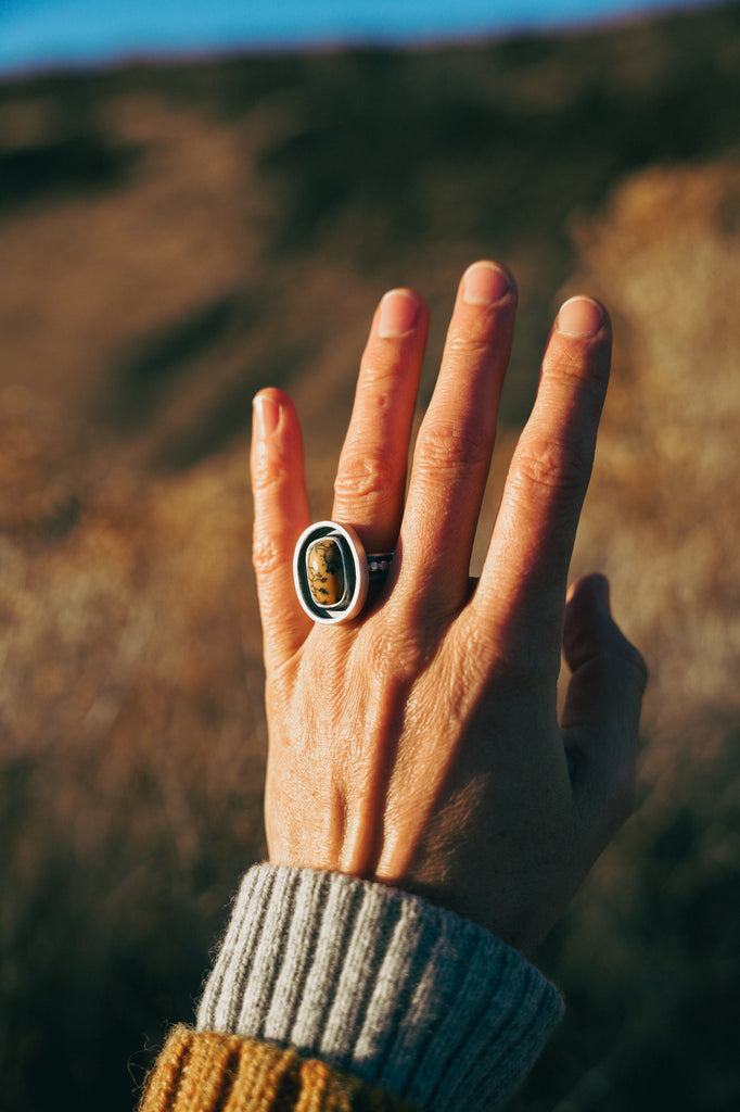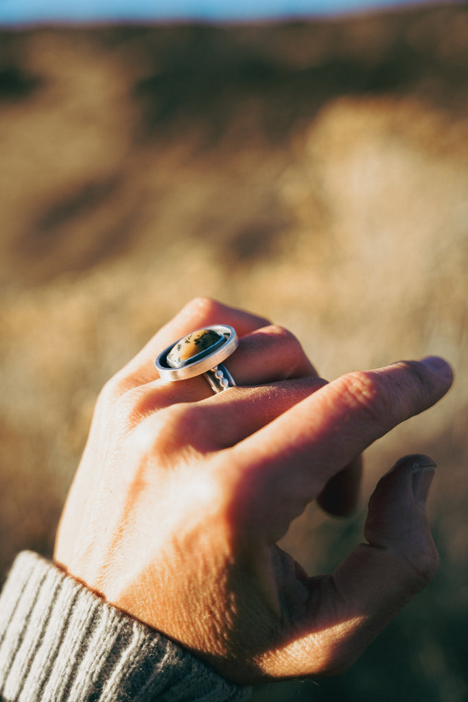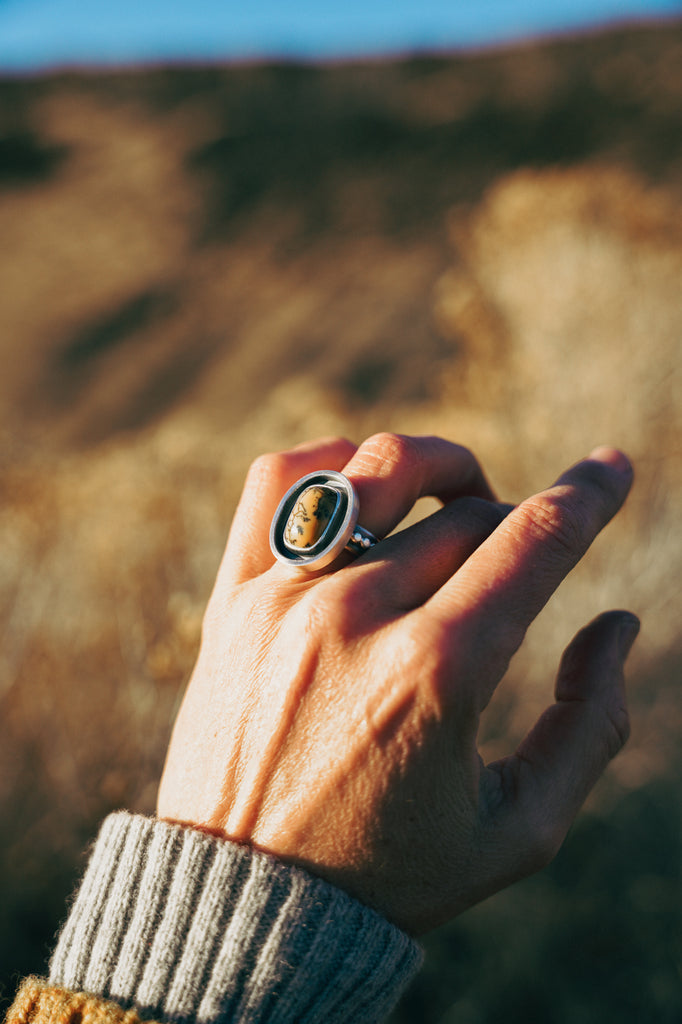 This Painter Ring features a cut of yellow dendritic opal -- looks like October on the steppe! This setting is modern and minimal, a true every day piece that is elevated by a chunky band that adds some heft and presence. These rings were so much fun to make, a true co-creation between earth processes and me, the jeweler.