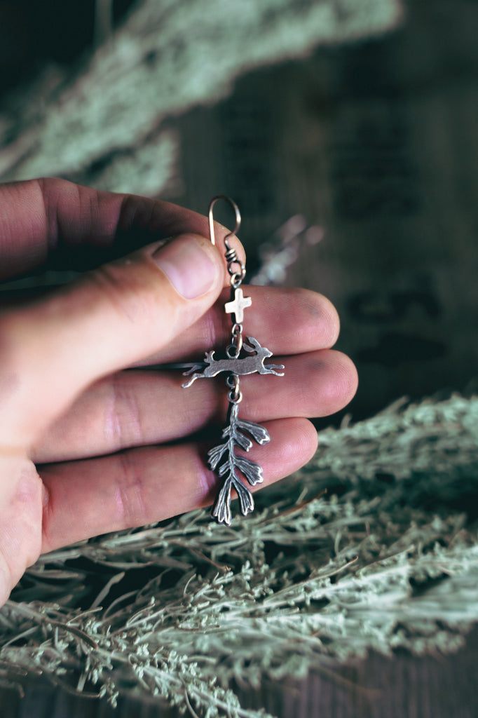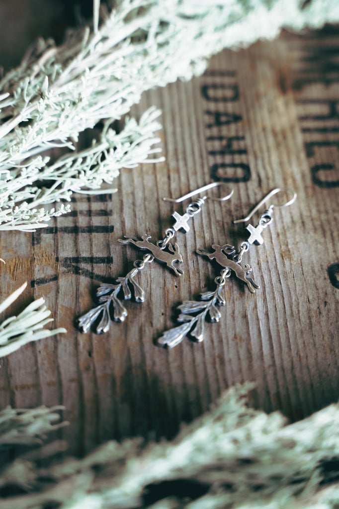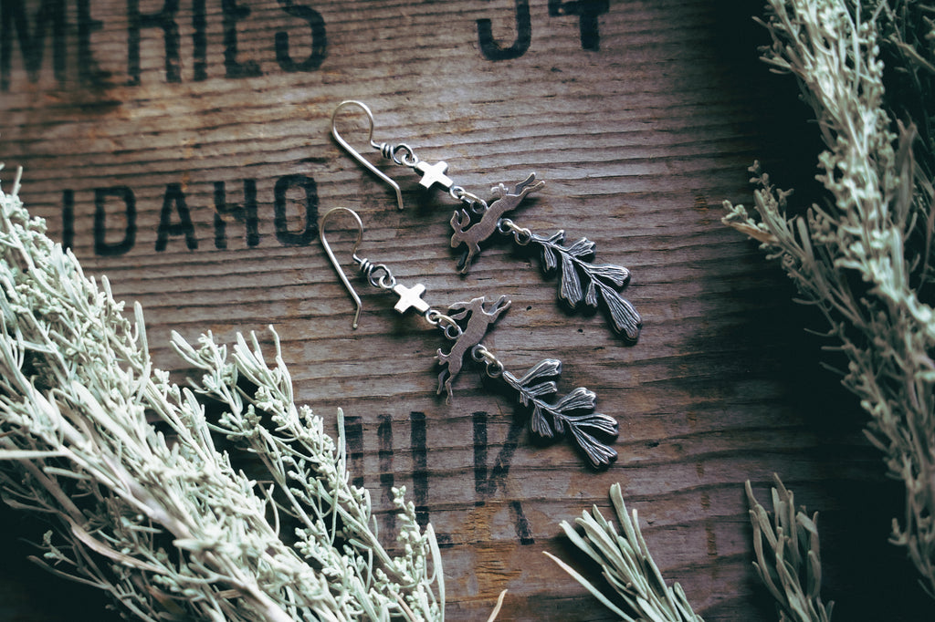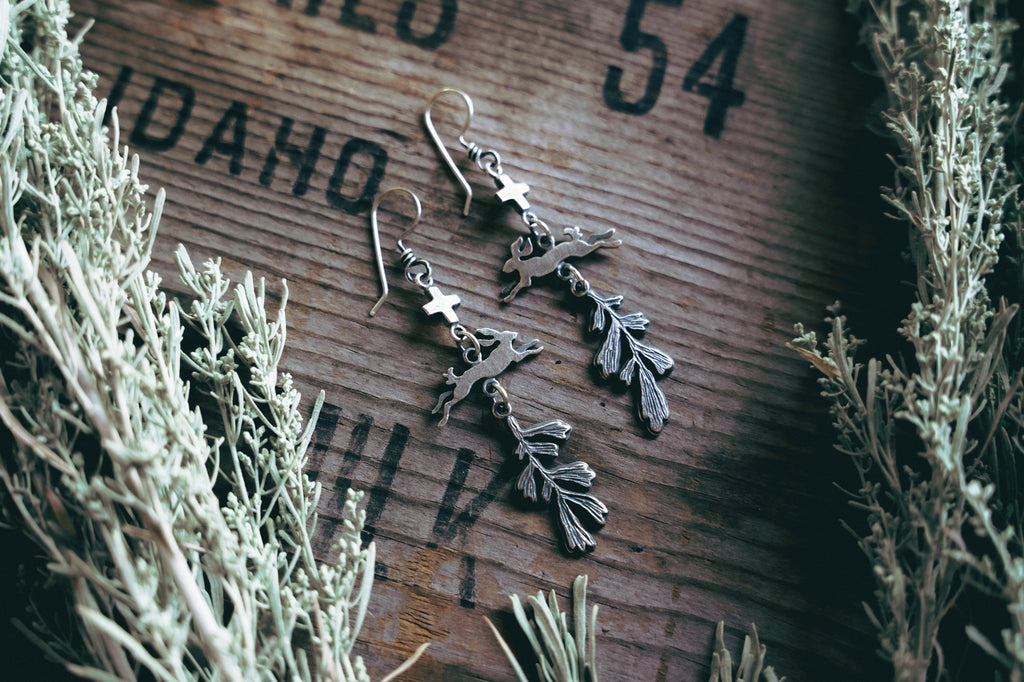 I love this earring design to death!!! Jackrabbits, sagebrush sprigs and square crosses descending from French ear wires.