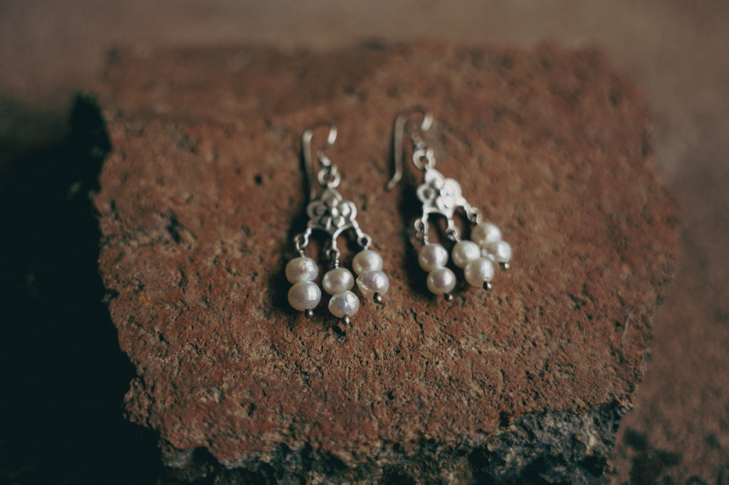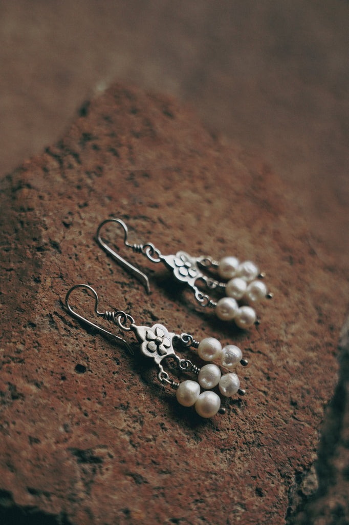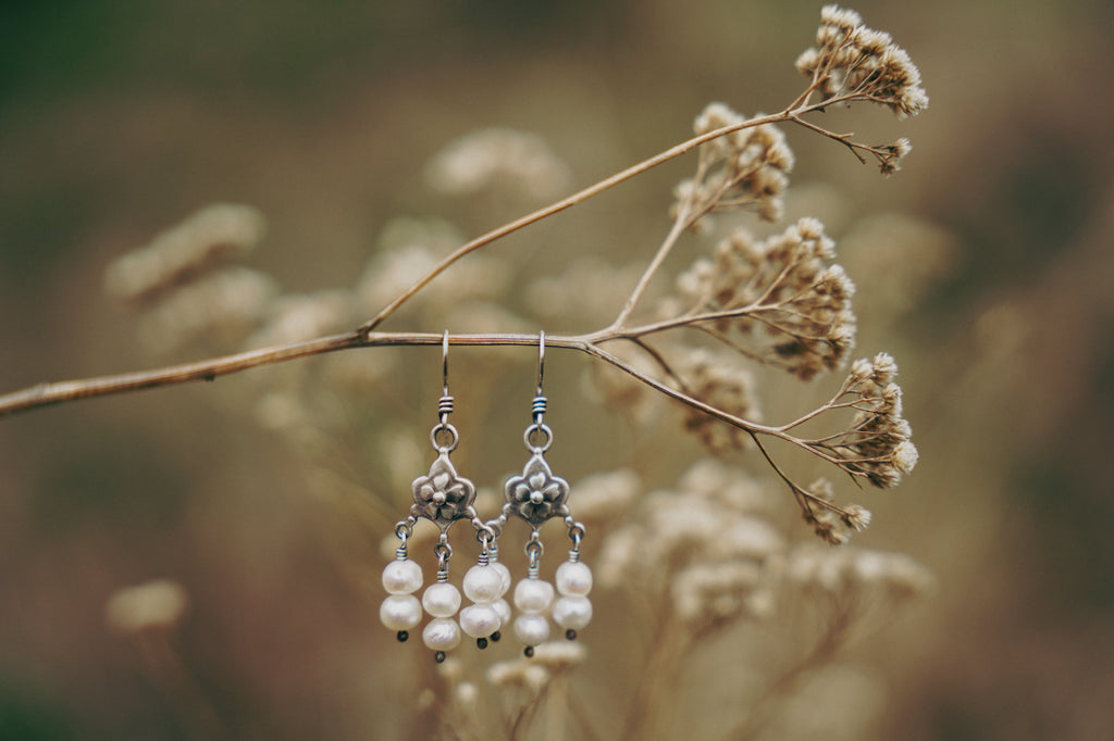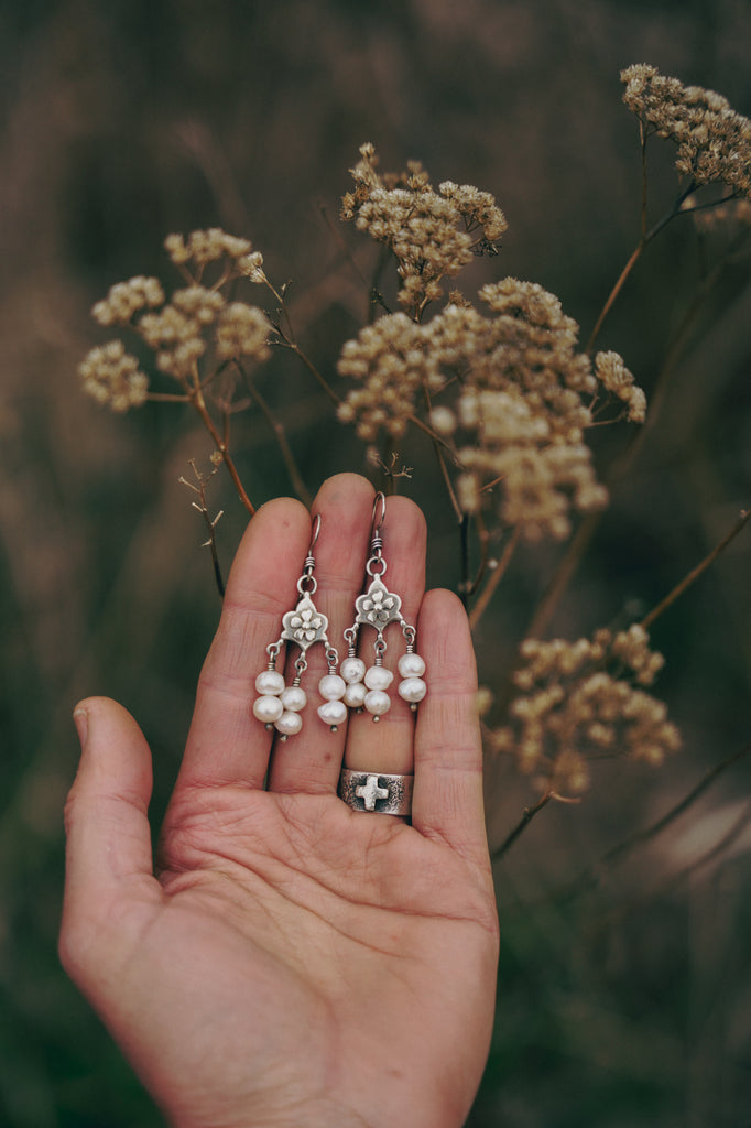 Shivery akoya pearls paired with fat little sterling components I have overlaid with a flower motif. Delicate and pretty with plenty of movement and a really great antique feel and look.