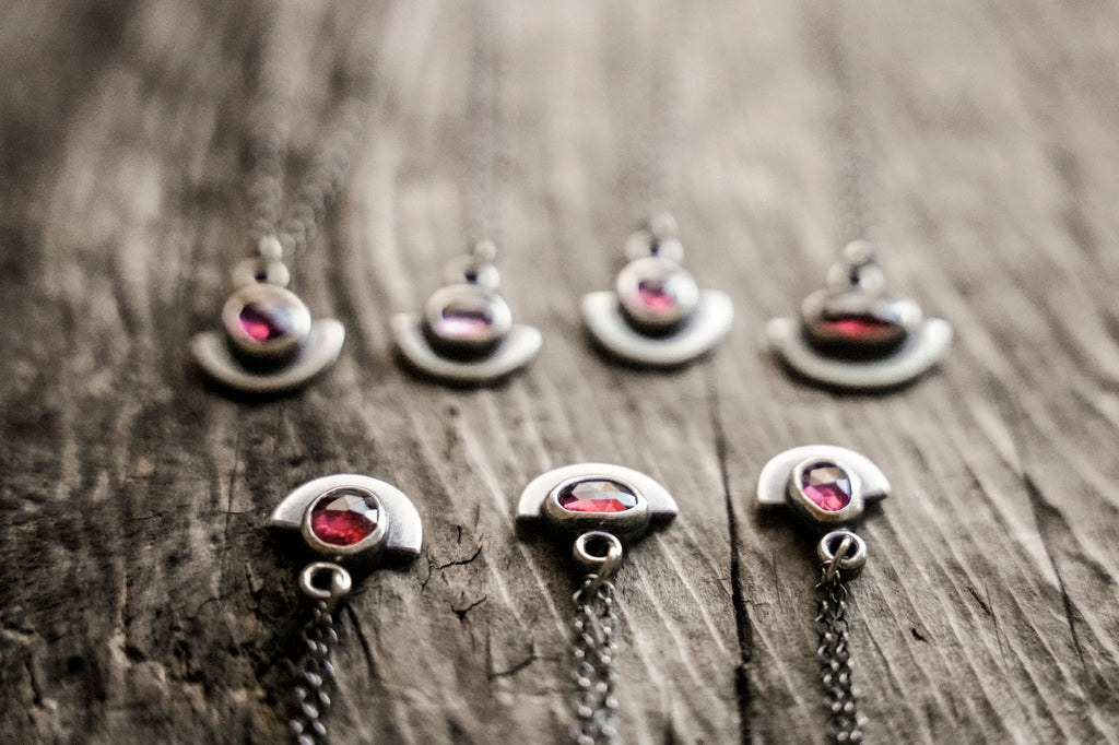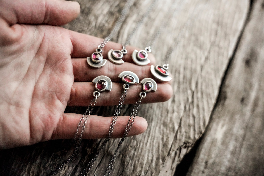 Sterling silver paired with pink garnets -- these little necklaces are heavily built and wear with small but mighty presence.