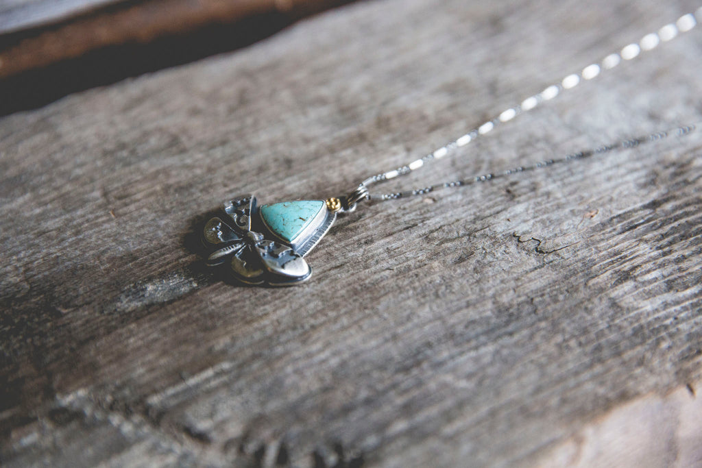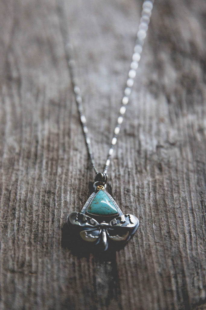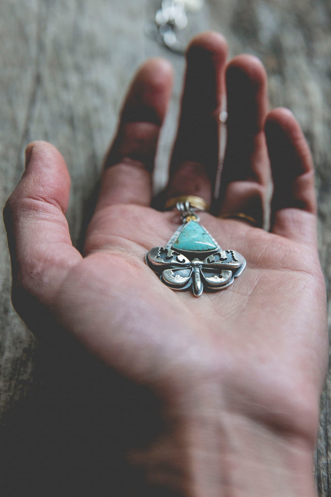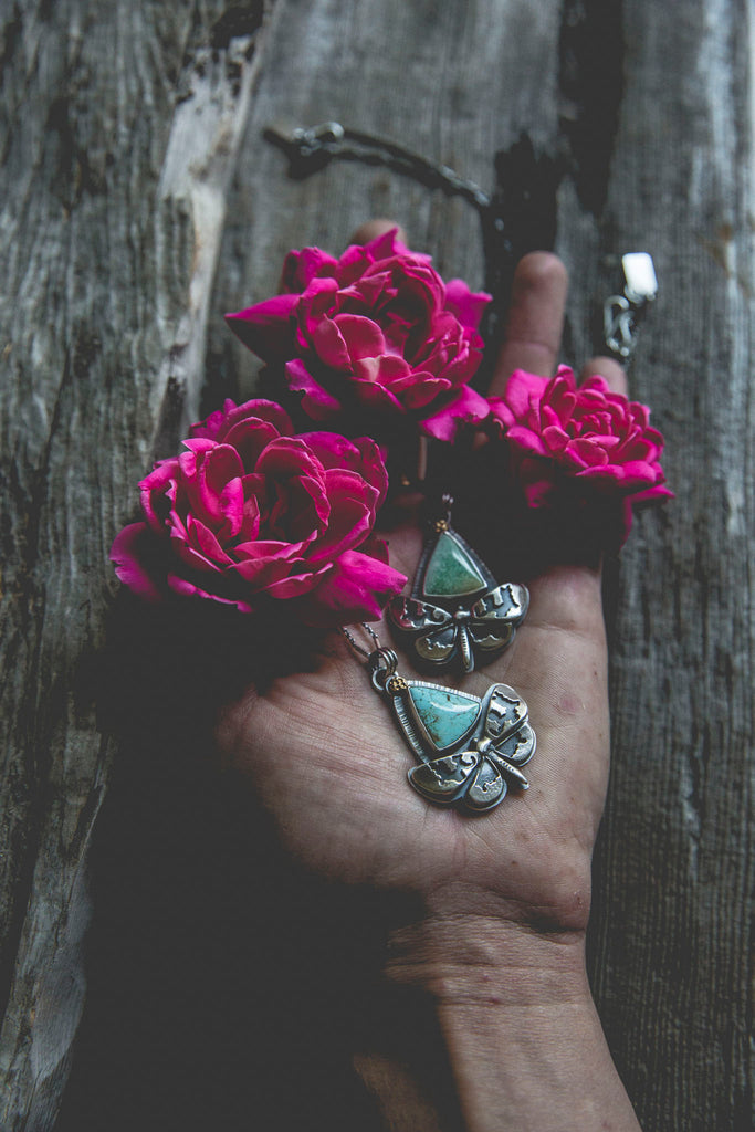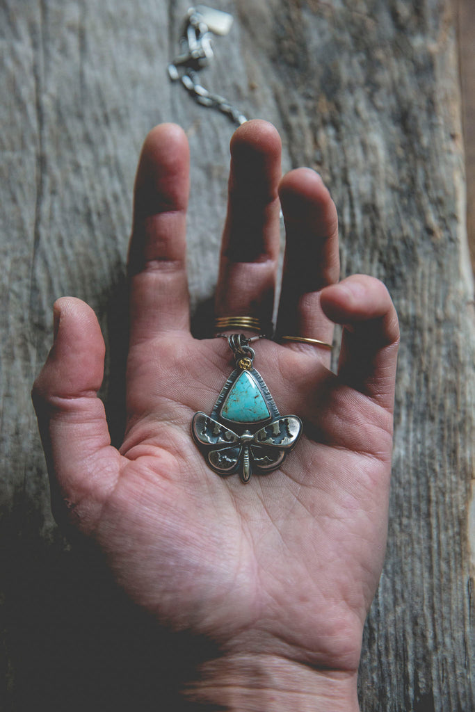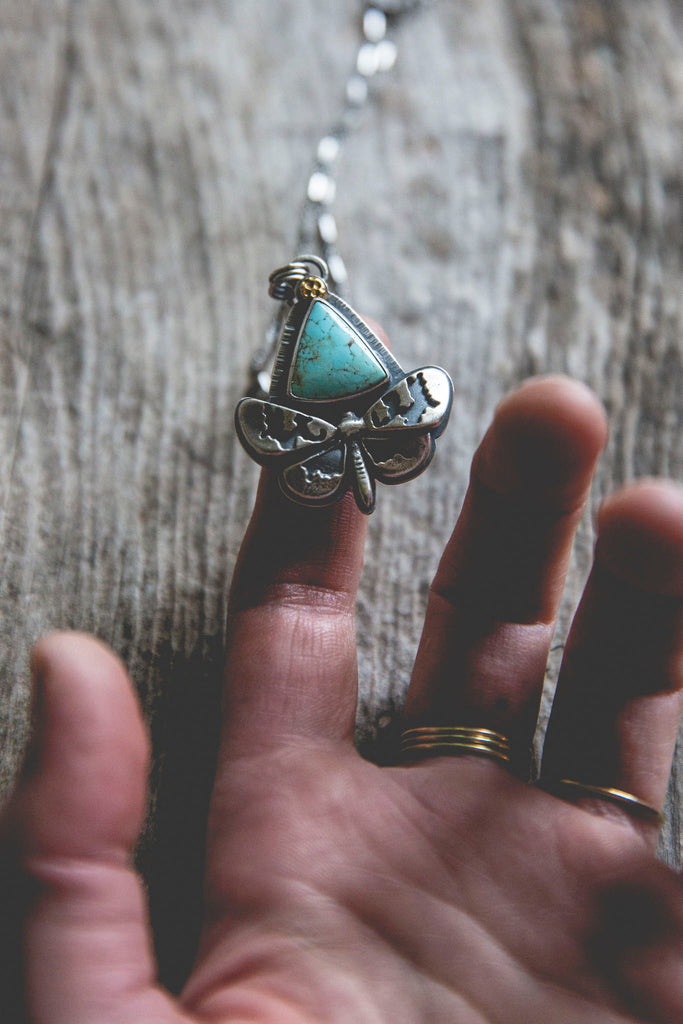 A slice of heaven...I MEAN TURQUOISE...paired with 22K gold and one of my beautiful, dimensional butterflies. This necklace design is one of my top ten favorite designs. I love it. The robust and thrumming life of my gardens inspired it. It is elegant, it speaks to the quiet beauty of nature and it has a perfect combination of elements. I'm so pleased with it...it pleases me as much as the real thing, as much as sitting in my flower garden watching the moths, butterflies, bees and hummingbirds in the blossoms I grew specifically for them. Being alive is a kind of effortless labor of love. This necklace makes me feel it all.