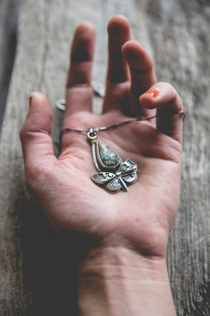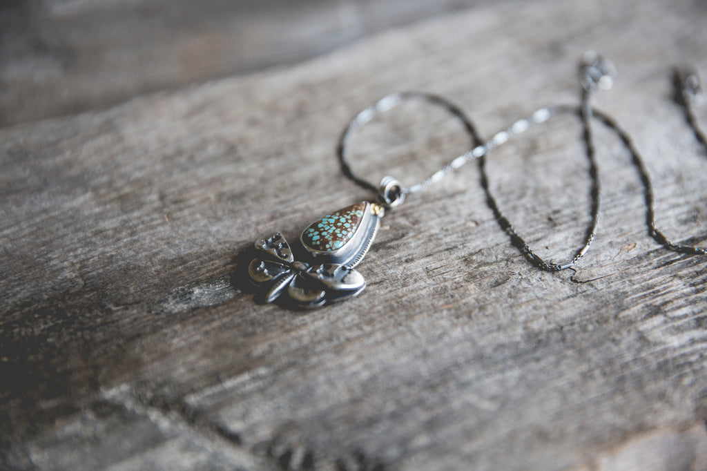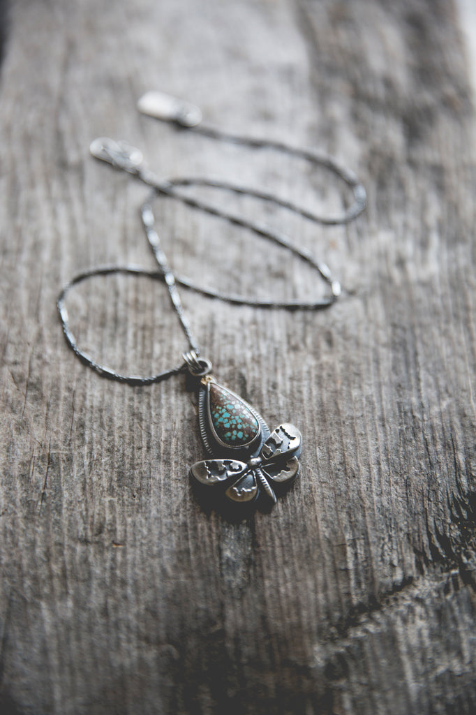 Whimsical American turquoise paired with 22K gold and one of my beautiful, dimensional butterflies. This necklace design is one of my top ten favorite designs. I love it. The robust and thrumming life of my gardens inspired it. It is elegant, it speaks to the quiet beauty of nature and it has a perfect combination of elements. I'm so pleased with it...it pleases me as much as the real thing, as much as sitting in my flower garden watching the moths, butterflies, bees and hummingbirds in the blossoms I grew specifically for them. Being alive is a kind of effortless labor of love. This necklace makes me feel it all.