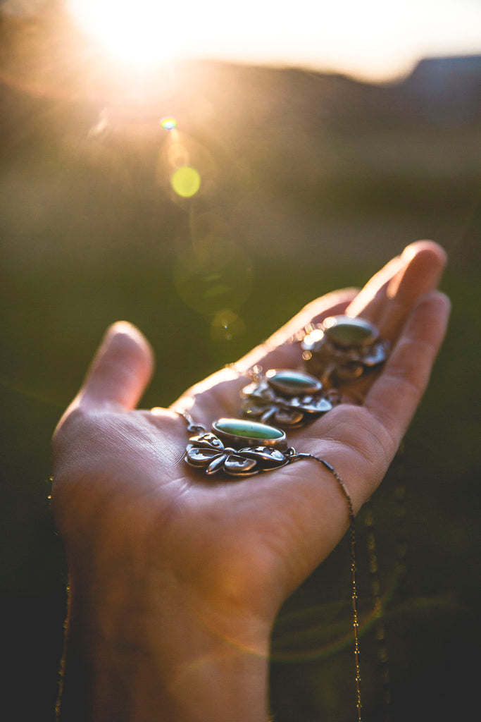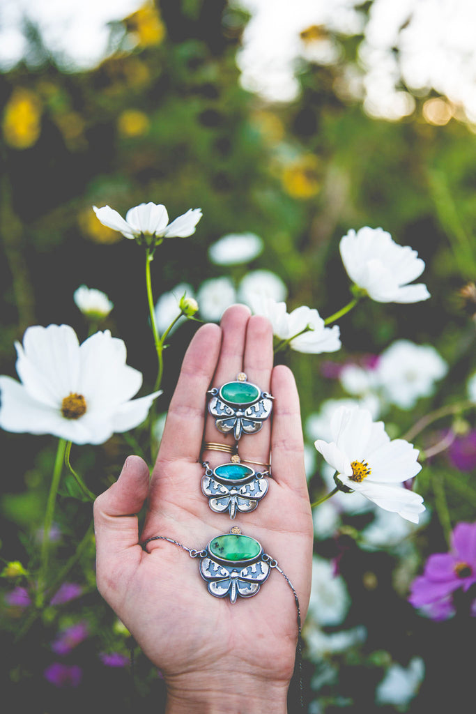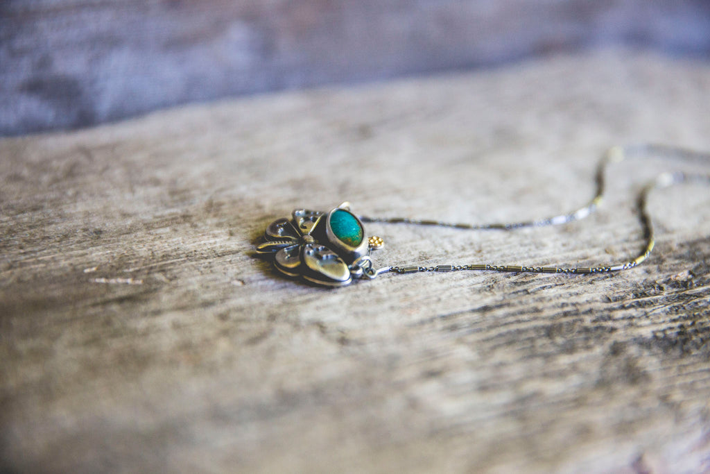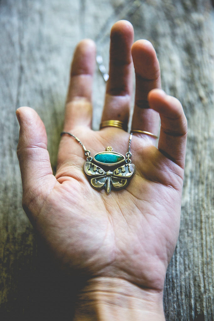 I've paired a gorgeous cut of deep teal turquoise paired with 22K gold and one of my beautiful, dimensional butterflies. This necklace design is one of my top ten favorite designs. I love it. The robust and thrumming life of my gardens inspired it. It is elegant, it speaks to the quiet beauty of nature and it has a perfect combination of elements. I'm so pleased with it...it pleases me as much as the real thing, as much as sitting in my flower garden watching the moths, butterflies, bees and hummingbirds in the blossoms I grew specifically for them. Being alive is a kind of effortless labor of love. This necklace makes me feel it all.