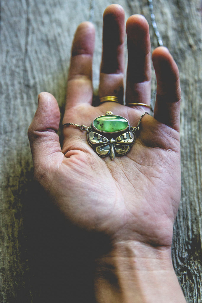 LUMINOUS chrysoprase paired with 22K gold and one of my beautiful, dimensional butterflies. This necklace design is one of my top ten favorite designs. I love it. The robust and thrumming life of my gardens inspired it. It is elegant, it speaks to the quiet beauty of nature and it has a perfect combination of elements. I'm so pleased with it...it pleases me as much as the real thing, as much as sitting in my flower garden watching the moths, butterflies, bees and hummingbirds in the blossoms I grew specifically for them. Being alive is a kind of effortless labor of love. This necklace makes me feel it all.