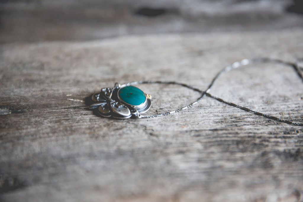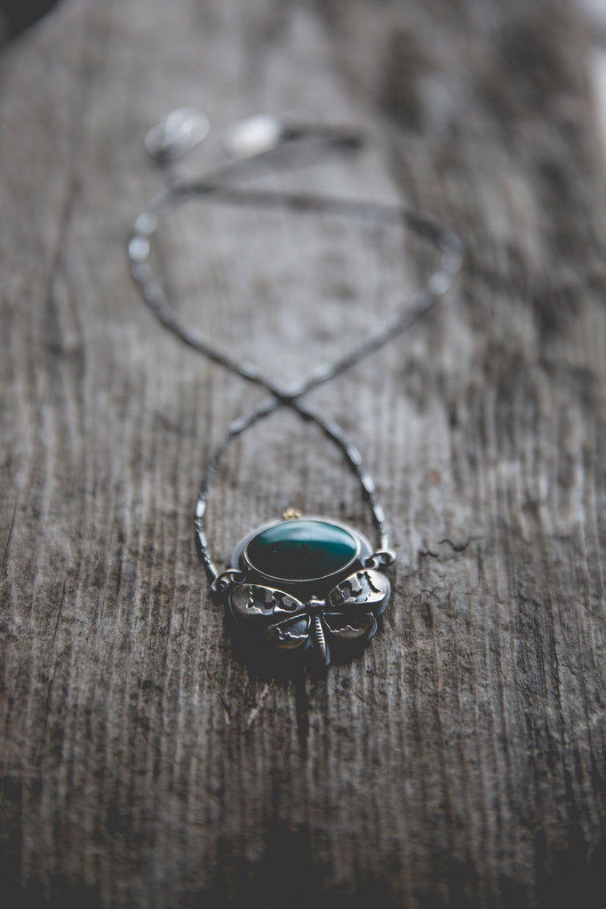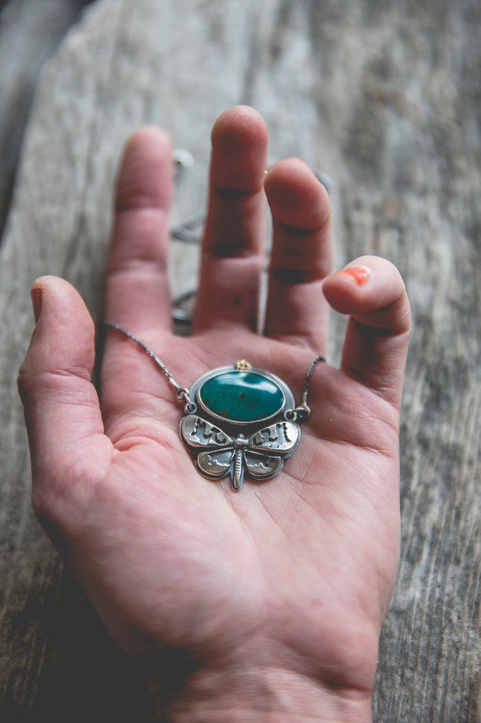 A deep teal blue cut of American turquoise (as secretive as the ocean) paired with 22K gold and one of my beautiful, dimensional butterflies. This necklace design is one of my top ten favorite designs. I love it. The robust and thrumming life of my gardens inspired it. It is elegant, it speaks to the quiet beauty of nature and it has a perfect combination of elements. I'm so pleased with it...it pleases me as much as the real thing, as much as sitting in my flower garden watching the moths, butterflies, bees and hummingbirds in the blossoms I grew specifically for them. Being alive is a kind of effortless labor of love. This necklace makes me feel it all.