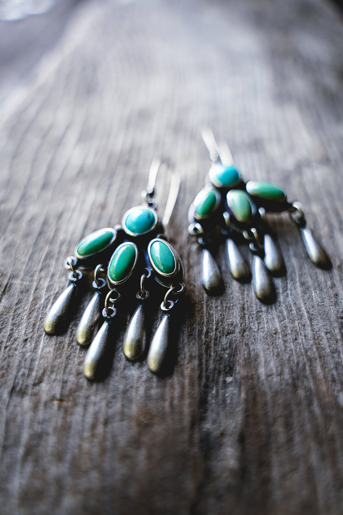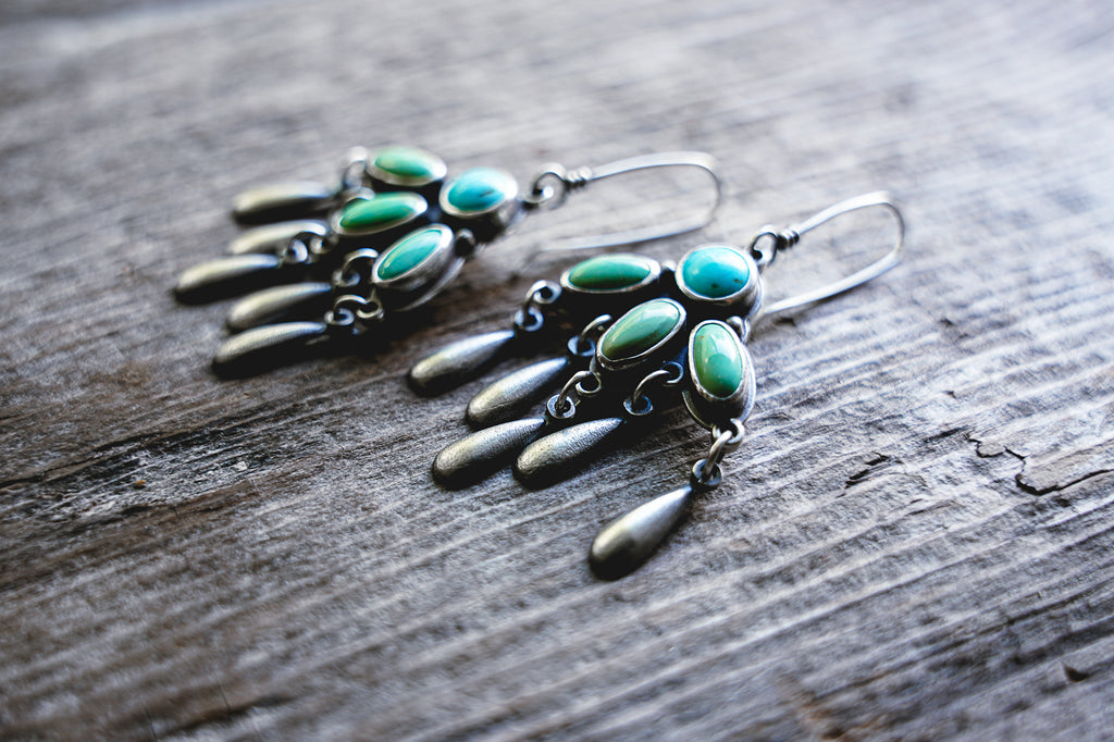 Sterling silver and Kingman turquoise in bright sky blue and green with a flight of raindrops on long French ear wires. There's some beautiful movement to this design.