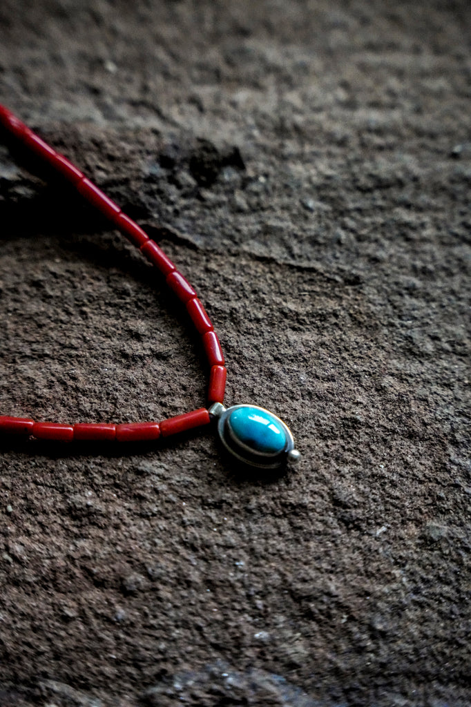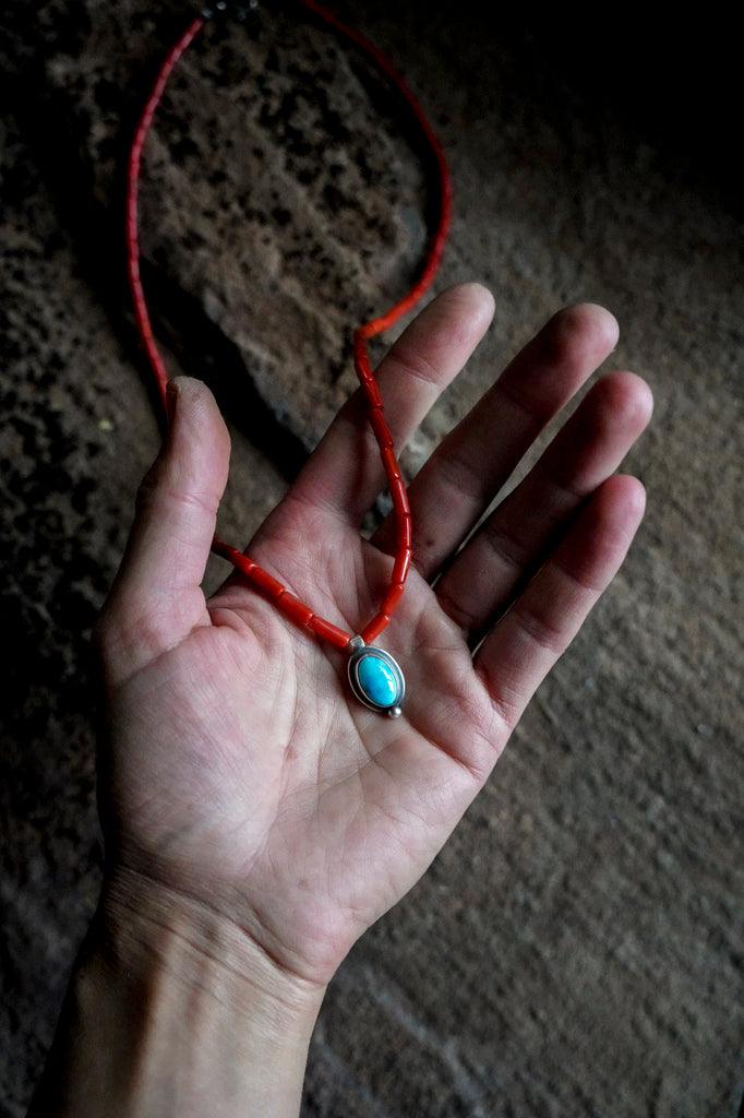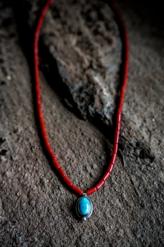 I've paired a merry cut of American turquoise (this stone really IS the color of a bluebird) with a GORGEOUS strand of thick Italian red coral beads -- a classic and ancient combination that speaks of earth and sky. This necklace series is so special!