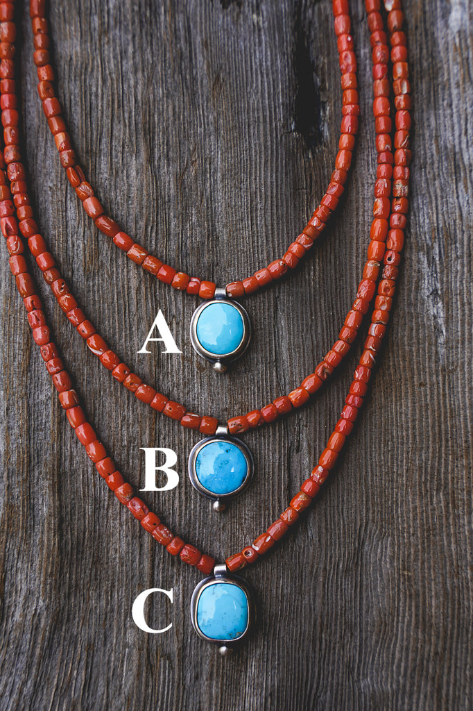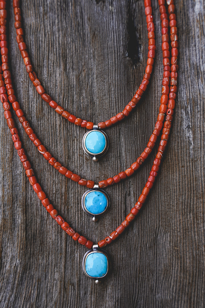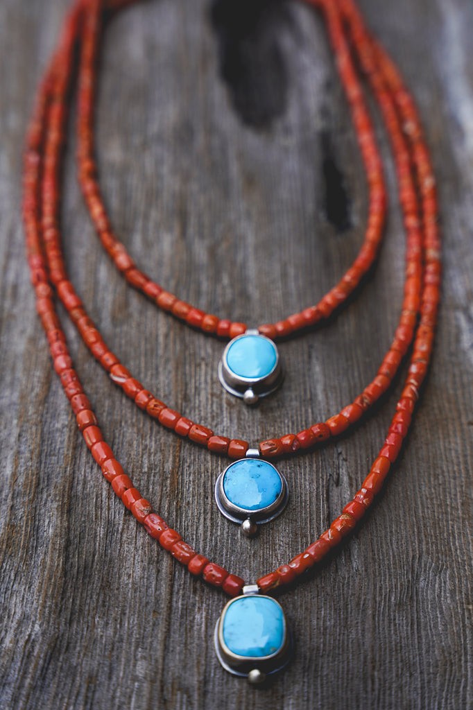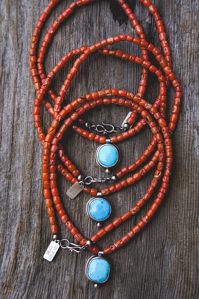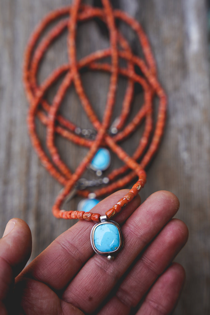 I've paired pure blue Kingman turquoise with Sciacca Coral in a really beautiful orange red hue -- a classic and ancient combination that speaks of earth and sky.
