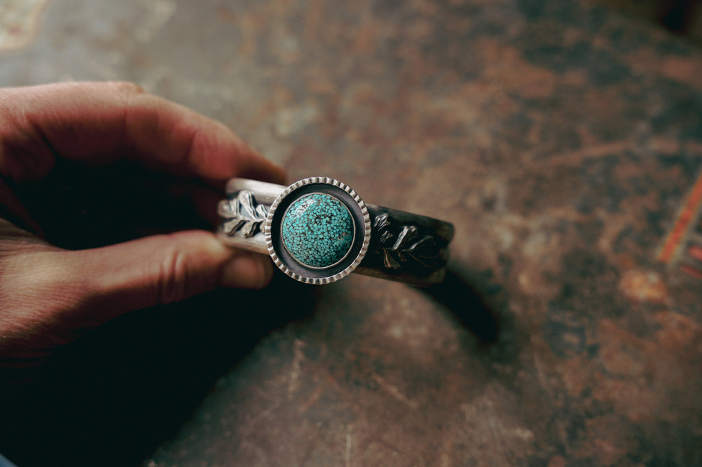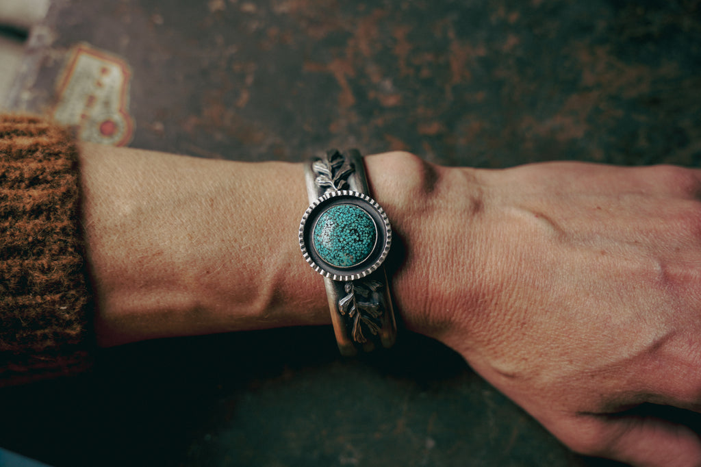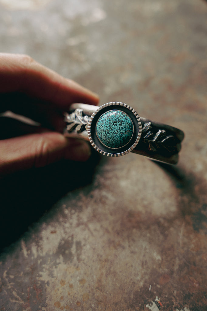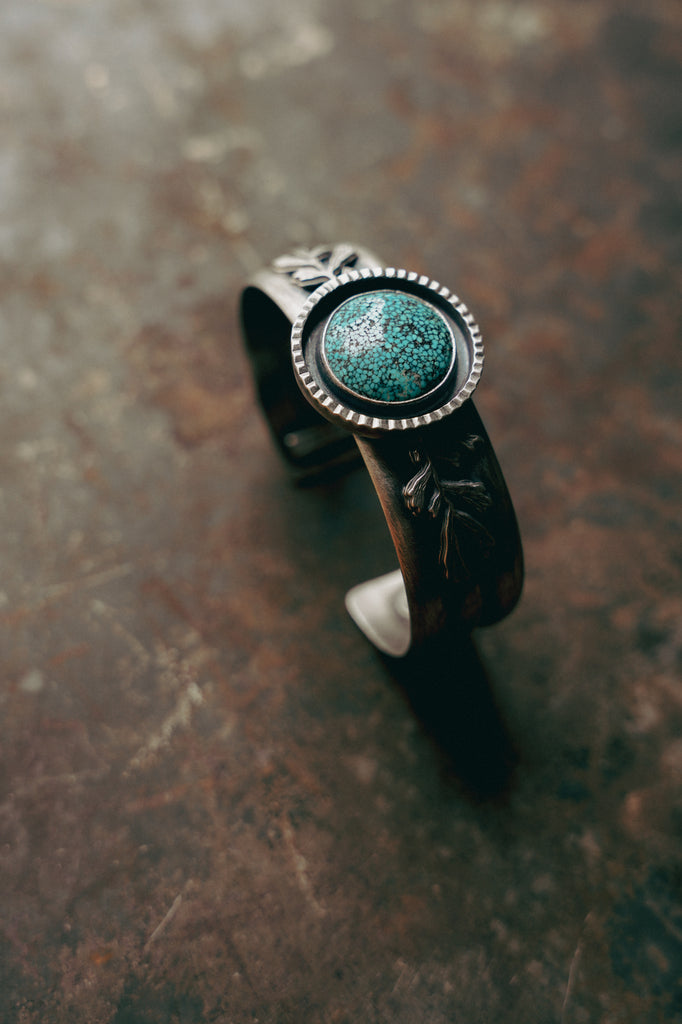 A straggler piece of inventory from my Old Salt Festival collection! Inspired by the landscape I do my living in. Old Kingman Turquoise caps this easy wearing cuff. My sagebrush sprigs add some love from the West.