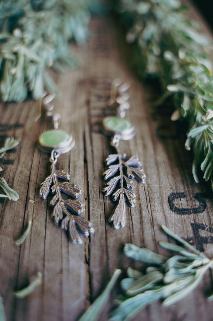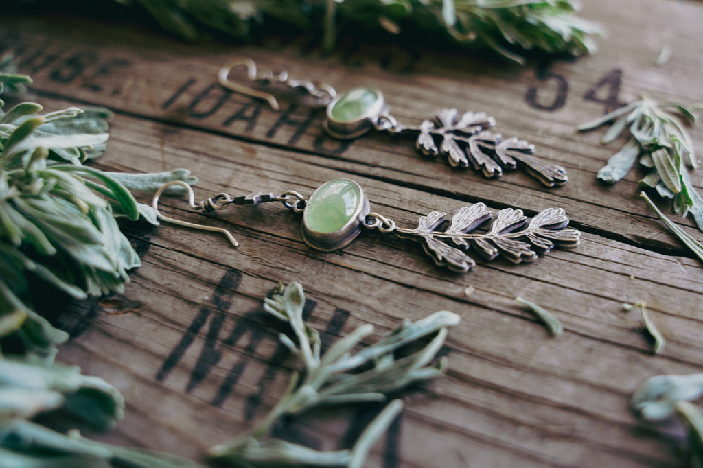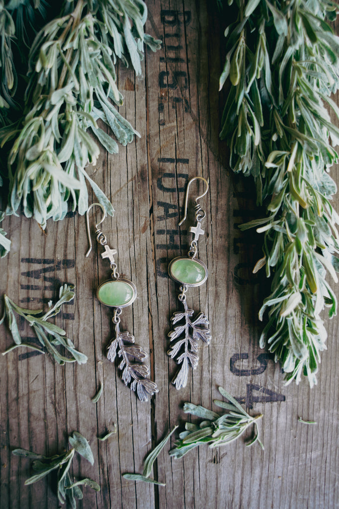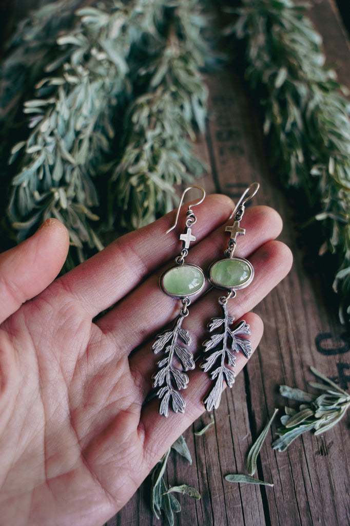 Glowing prehnite cabochons with sagebrush sprigs and square crosses.