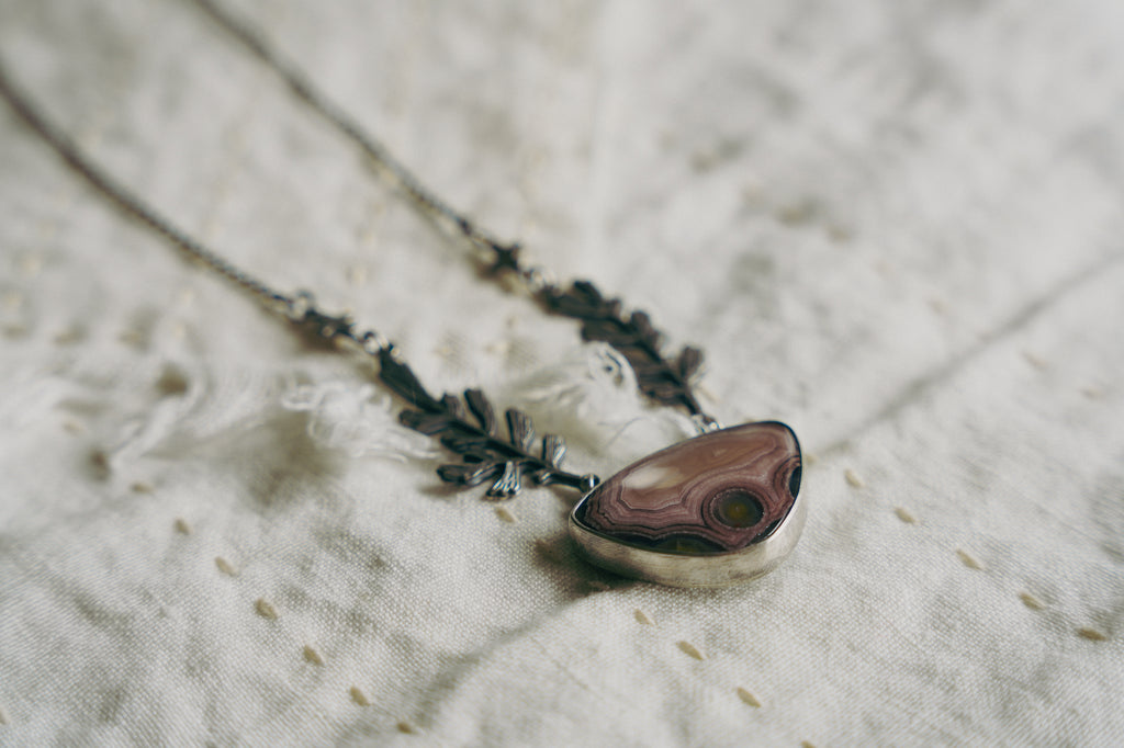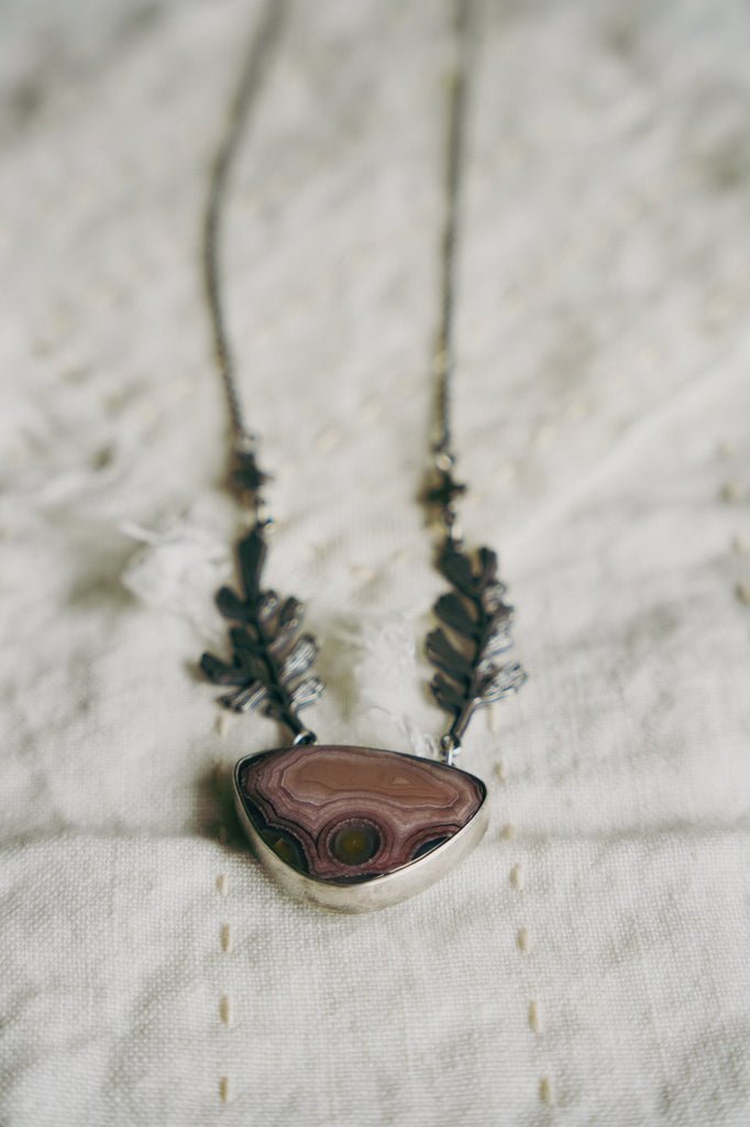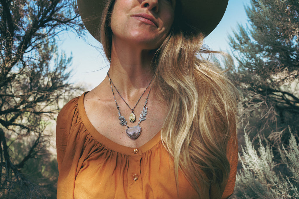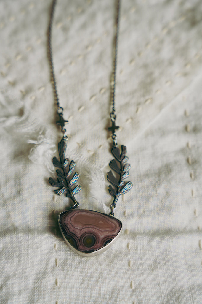 Another ode to the sagebrush sea, the place I do my living here in the West. This particular necklace features a beautiful cut of Agua Nueva Agate in wispy bands of pink, peach and muted yellow, like the end of a sunset over the river canyon. I've suspended it between sage sprigs and square crosses.