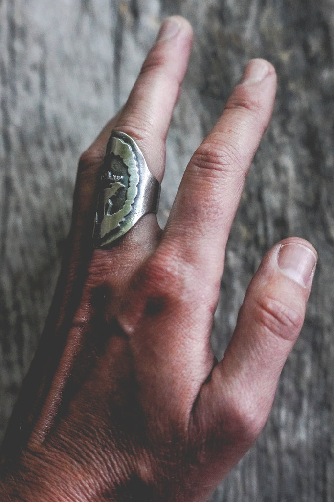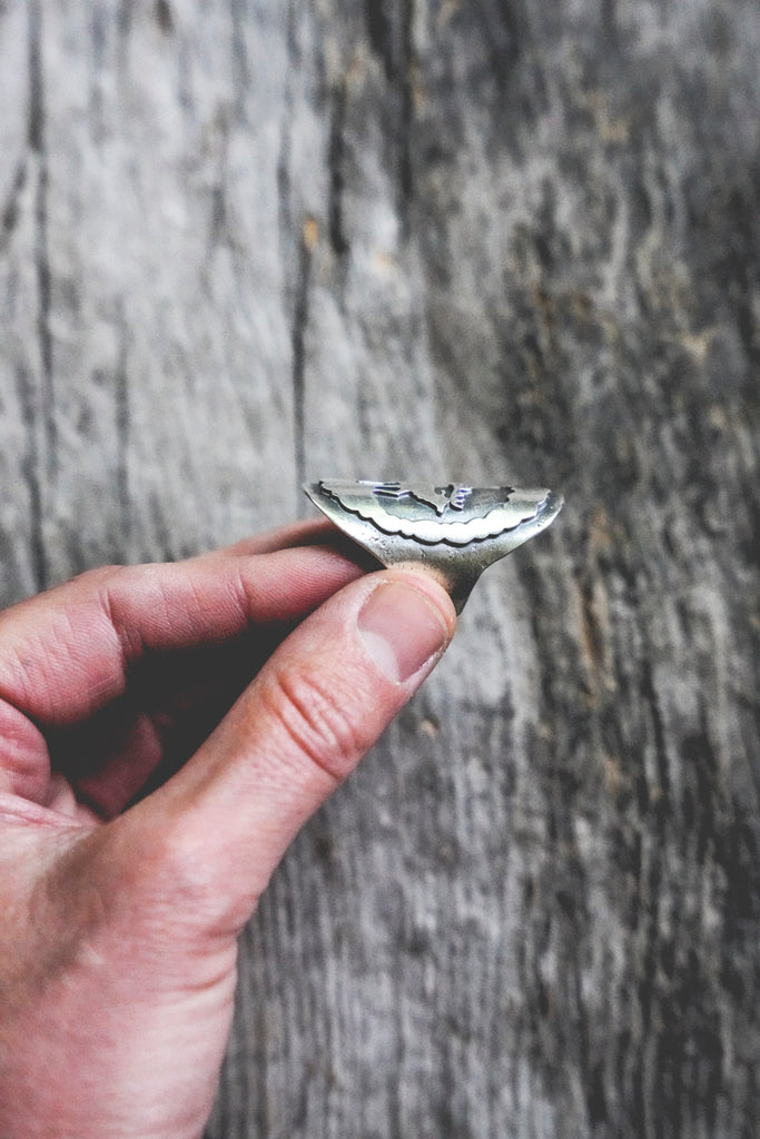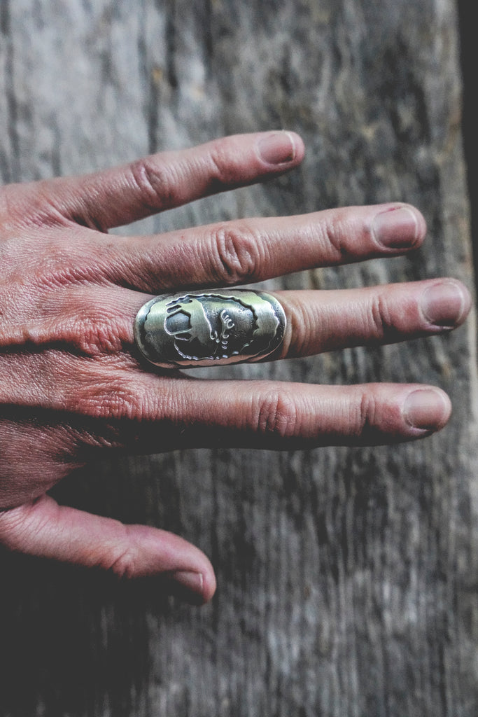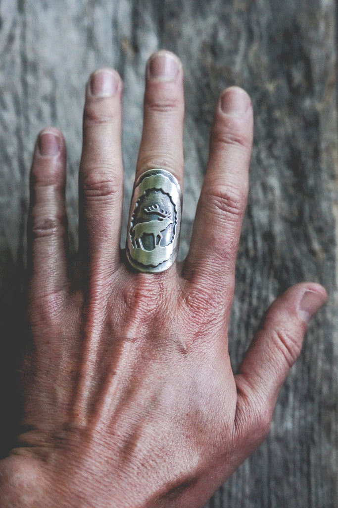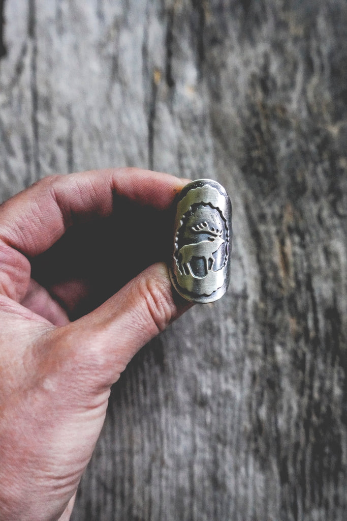 I have been working on building a fleet of these elk rings and the batch I am selling today is all the sizing prototypes I built while trying to decide on metal gauges, design size, texturing, etc.