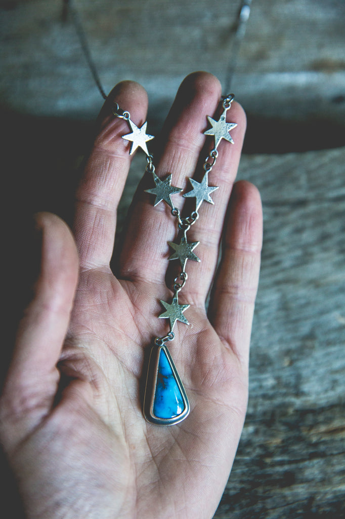 A beautiful wedge of Ithaca Peak turquoise paired with a spangling of sterling silver stars. This piece was made to shine, so were you. Shine on.
