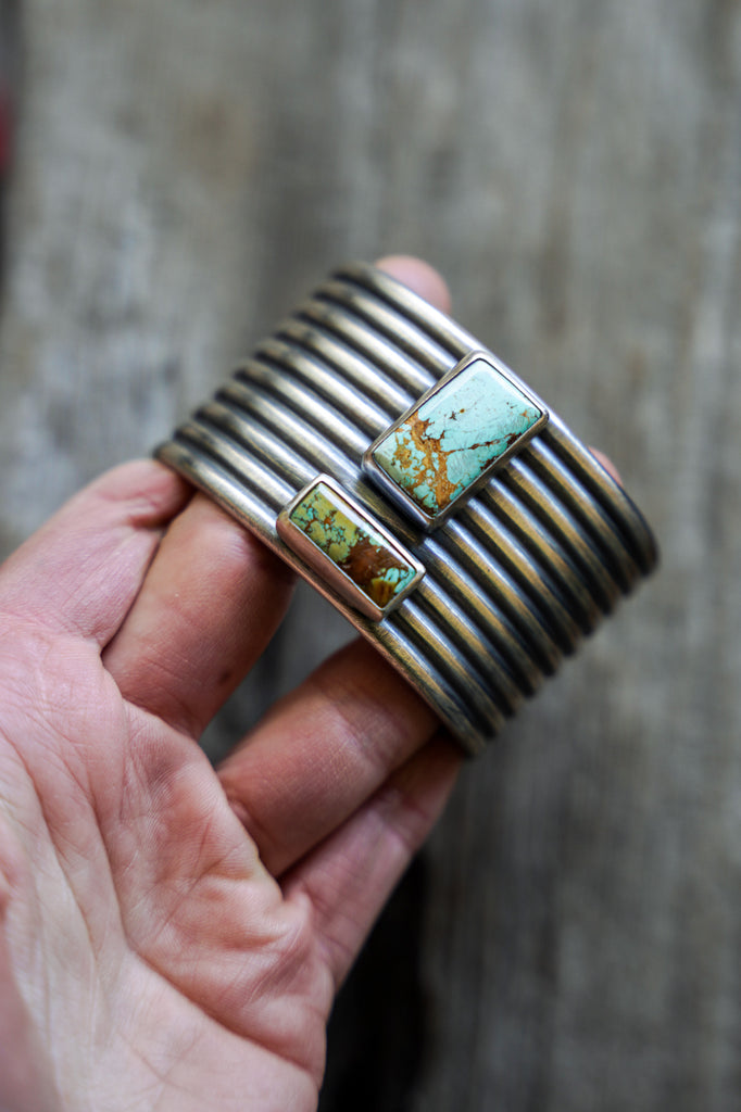 This piece is HEAVILY built. The oxidation and satin finishing gives it a graphic, textural appearance. I've set it with two freeform cuts of Kingman Turquoise.