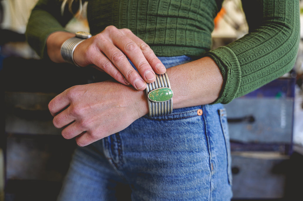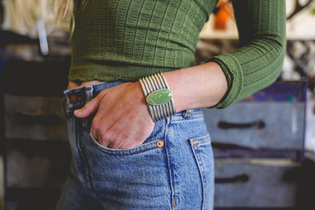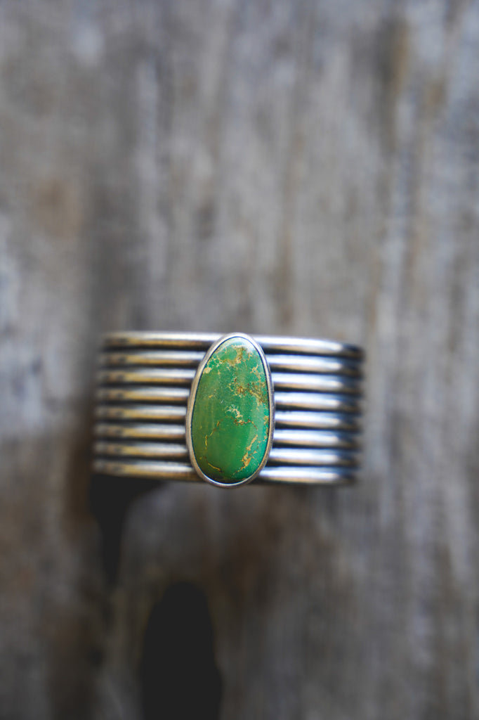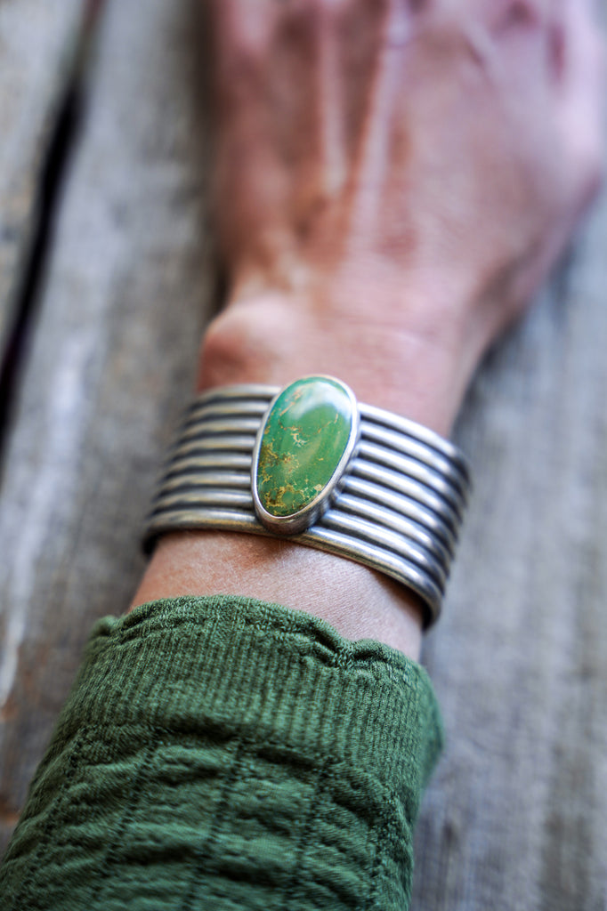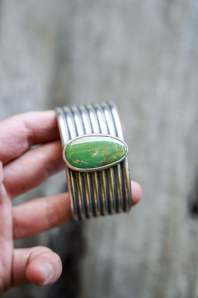 This piece is HEAVILY built. The oxidation and satin finishing gives it a graphic, textural appearance. I've set it with a big cut of Kingman Turquoise in the most incredible green hues. I love this piece!
