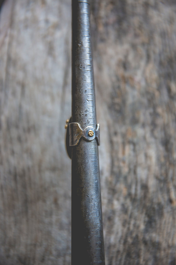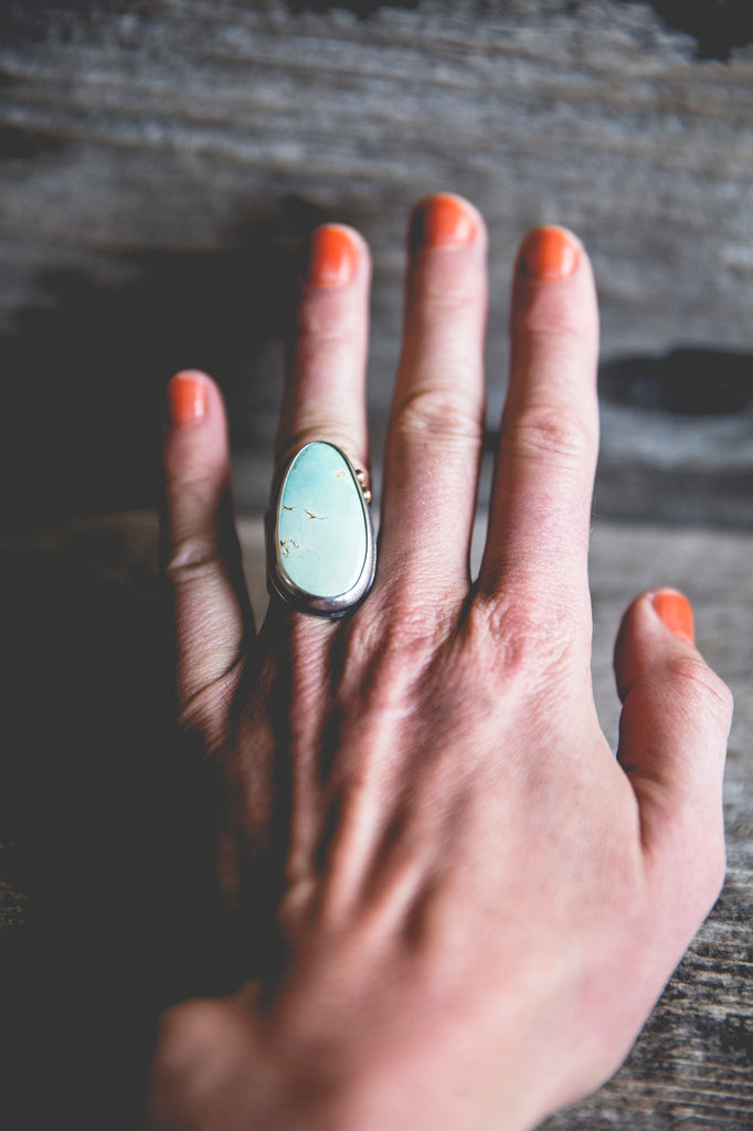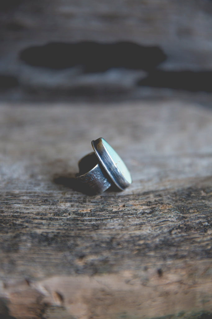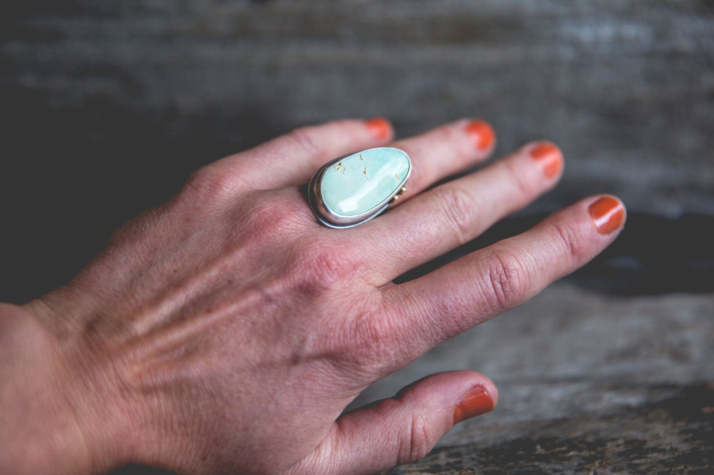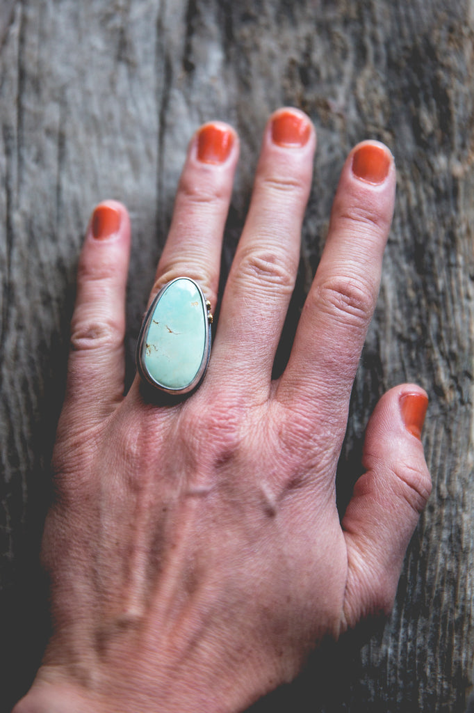 This ring features a beautiful cut of American turquoise in a very light, almost minty hue. I've set it in a heavy sterling setting with a couple of my sunflower centers in 14K gold flanking one edge of the bezel as well as the band taper. It's simple, but it's well built, cleanly crafted and enduring. You'll be surprised by the weight of it.