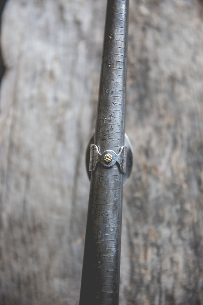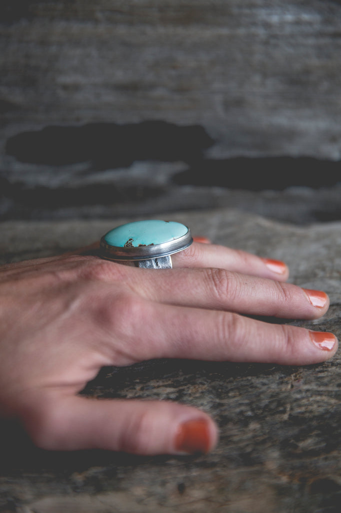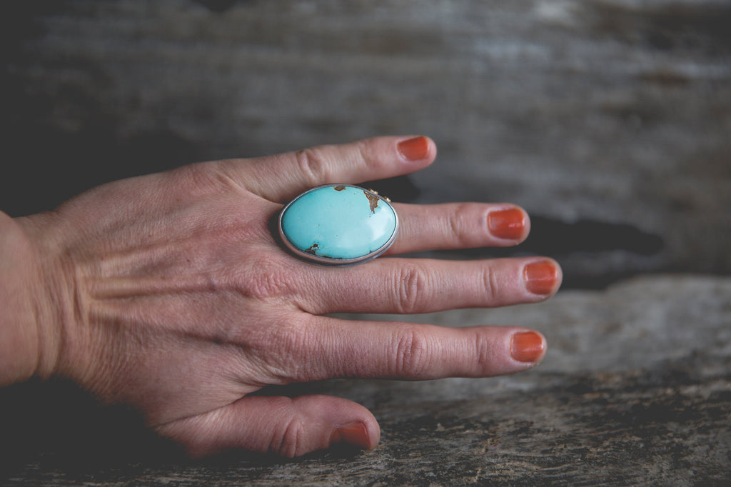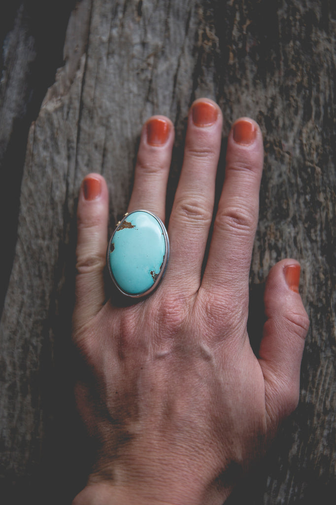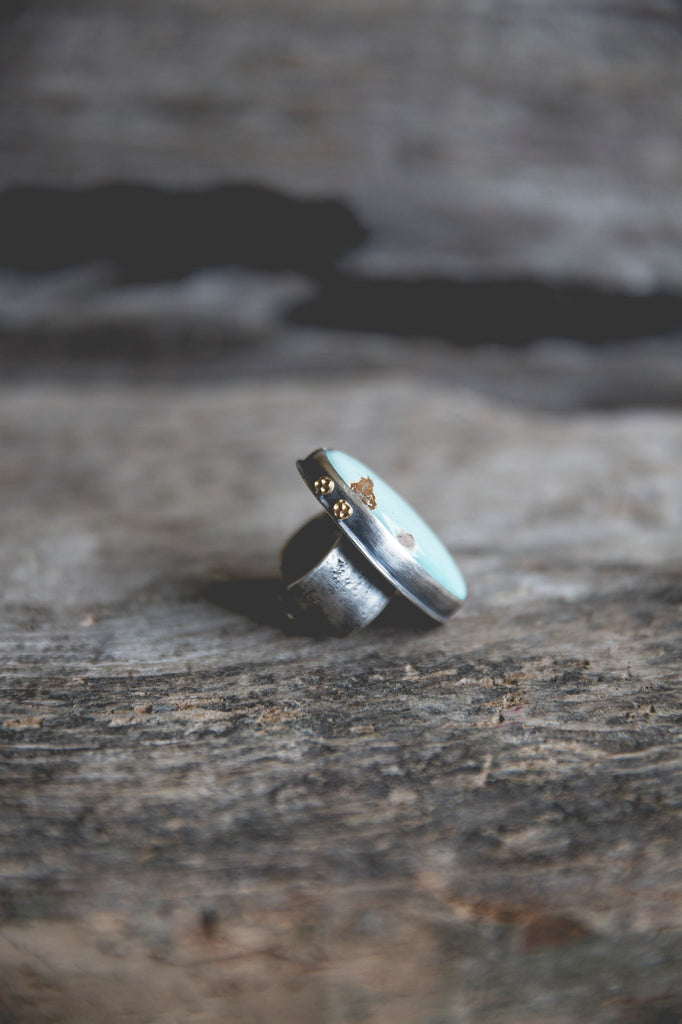 This ring features a big and beautiful cut of American turquoise in wonderful robin egg blue. I've set it in a heavy sterling setting with a couple of my sunflower centers in 14K gold flanking one edge of the bezel as well as the band taper. It's simple, but it's well built, cleanly crafted and enduring. You'll be surprised by the weight of it.