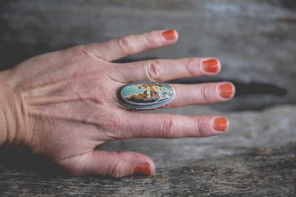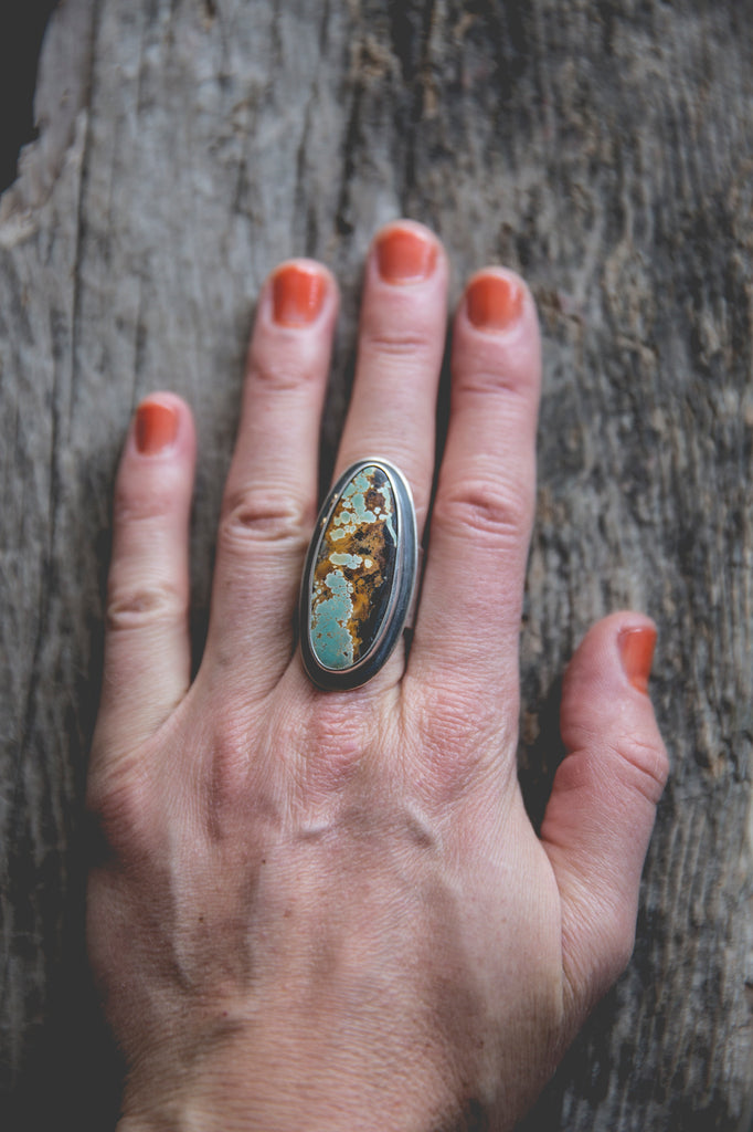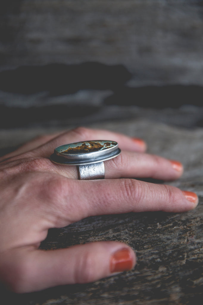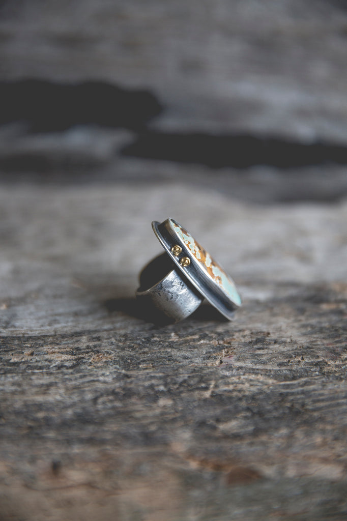 This ring features a GORGEOUS GORGEOUS cut of Sky Cloud Turquoise out of Nevada. I've set it in a heavy sterling setting with a couple of my sunflower centers in 14K gold flanking one edge of the bezel as well as the band taper. It's simple, but it's well built, cleanly crafted and enduring. You'll be surprised by the weight of it.