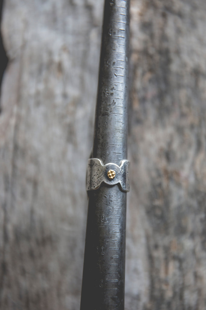 This ring measures a US Ring size 8.25 on a mandrel but it bears a new band design of mine that is 15mm wide with an ornamental taper. Please expect a snug fit that feels about a half size smaller than it measures.