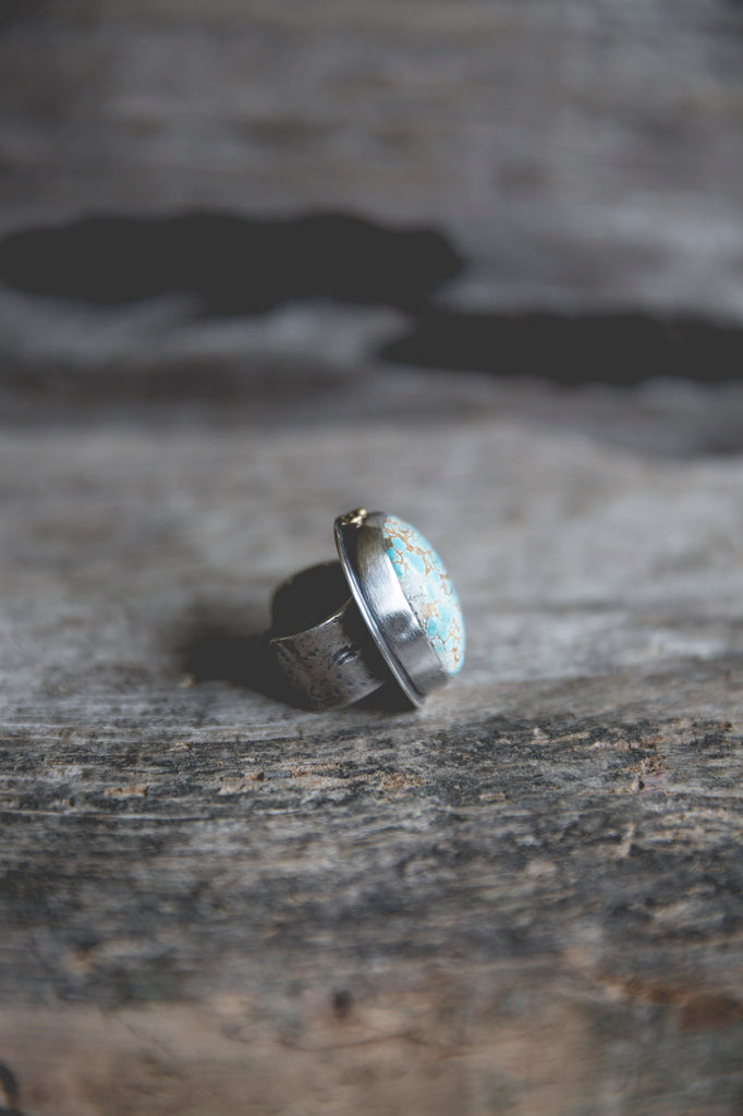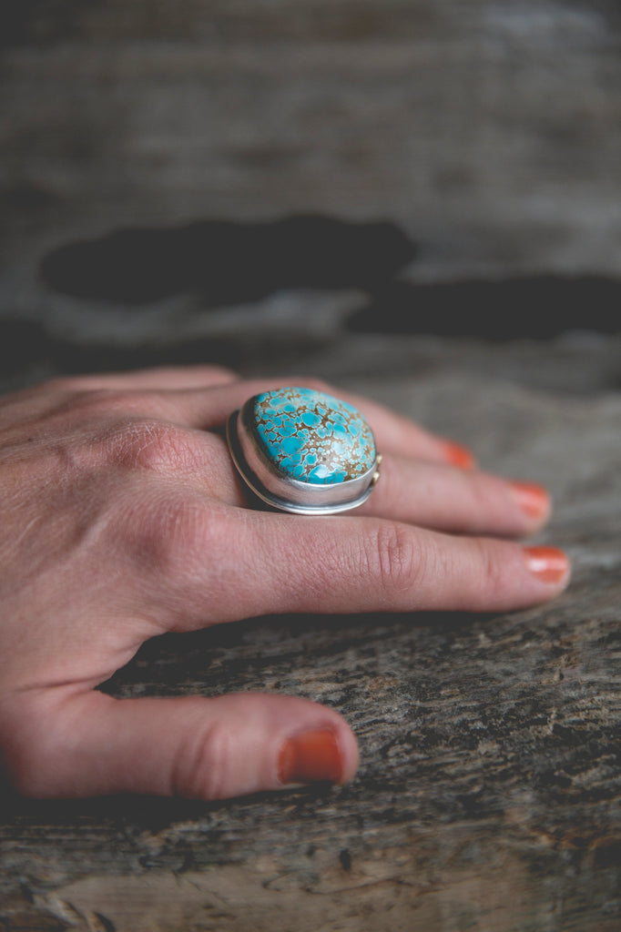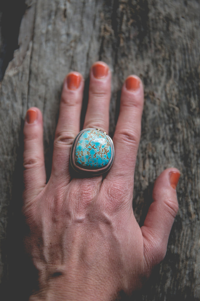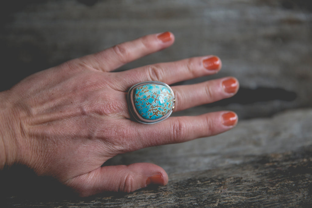 This ring features a beautiful cut of American turquoise in a very bright blue that is speckled with rusty matrix. GORGEOUS!!! It has a very high dome and it absolutely juicy looking. I've set it in a heavy sterling setting with a couple of my sunflower centers in 14K gold flanking one edge of the bezel as well as the band taper. It's simple, but it's well built, cleanly crafted and enduring. You'll be surprised by the weight of it.