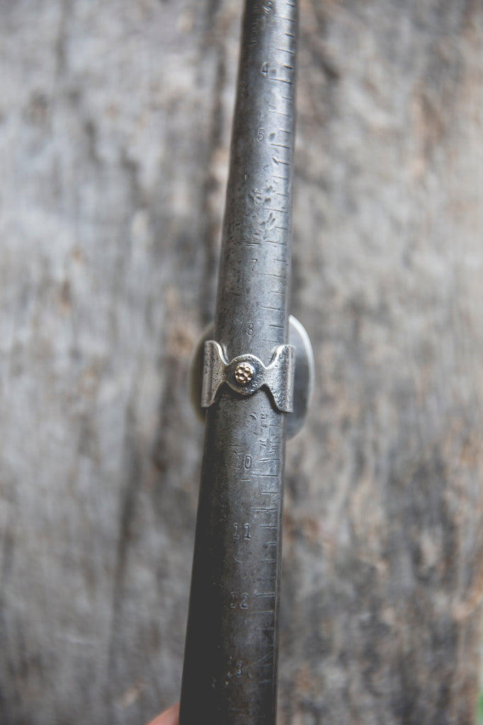 This ring measures a US Ring size 8.5 on a mandrel but it bears a new band design of mine that is 15mm wide with an ornamental taper. Please expect a snug fit that feels about a half size smaller than it measures.