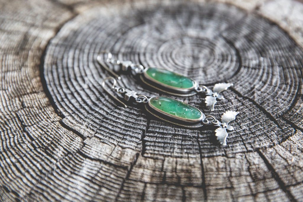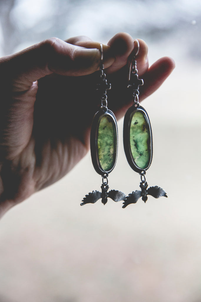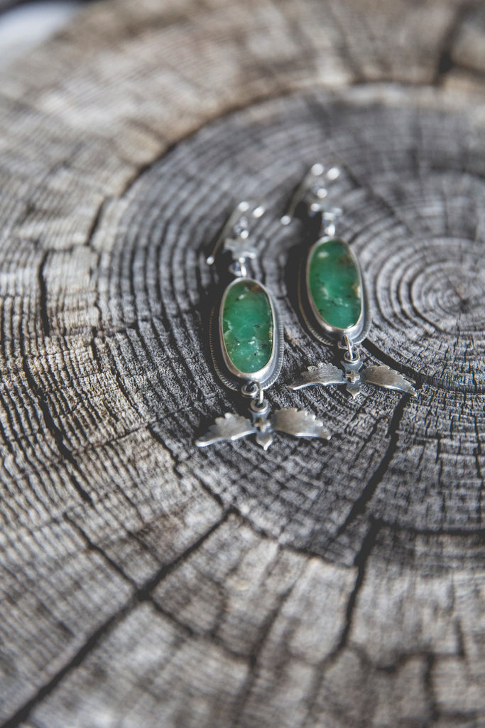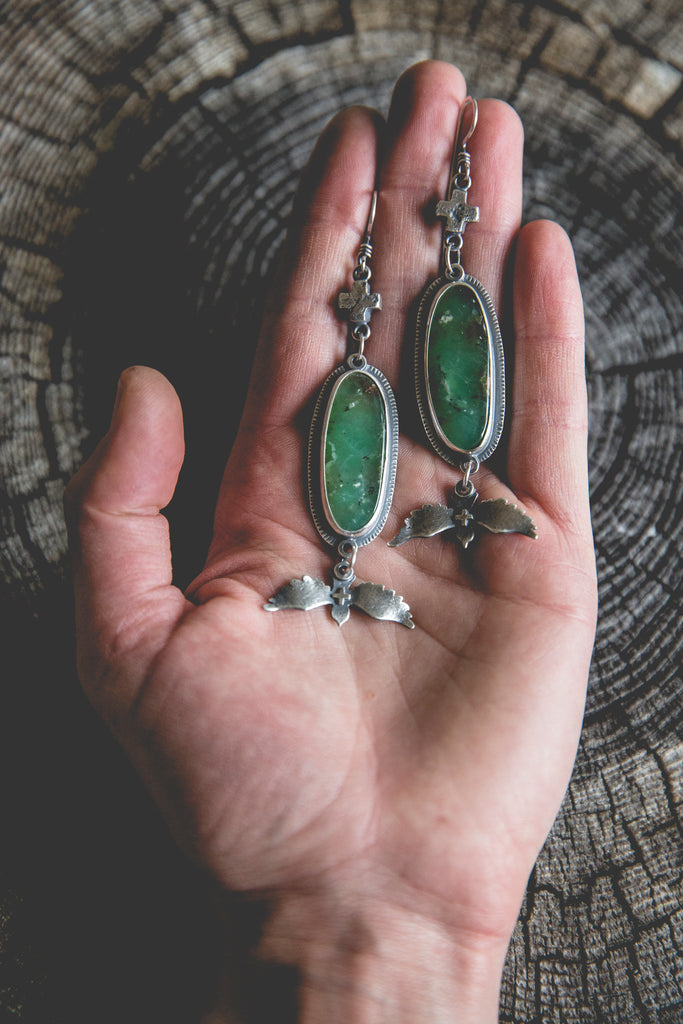 There always seems to be a new iteration for these sterling birds of mine, I do, after all, live in the kingdom of birds here on Idaho's beloved Snake River. And so, here they are again in a more ornate design featuring the square cross symbol I hold so dearly, cheery cuts of chrysoprase and wide winged birds stalled out on the high desert winds. I've opened the backs of these stone settings so the green of this chrysoprase is LUMINOUS.