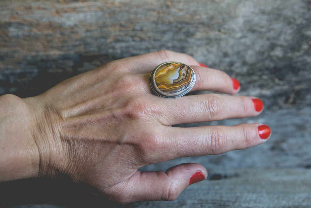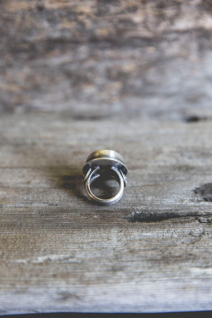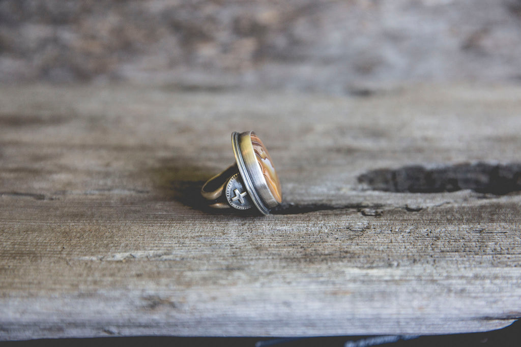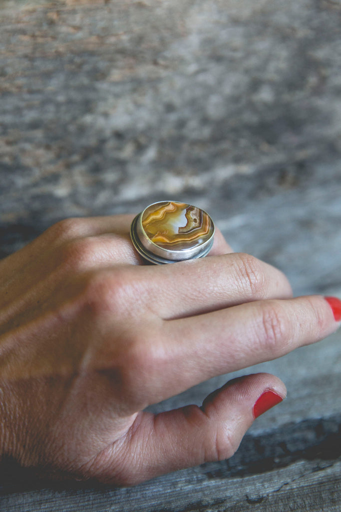 This ring features an amazing cut of Coyamito Agate -- just gorgeous, saturated yellows. I've made this ring simple but incredibly burly so that the beauty of the stone can sing out. It's meant to be worn anywhere. Take it to town, take it to your favorite alpine lake, take it anywhere you like -- it can handle it.